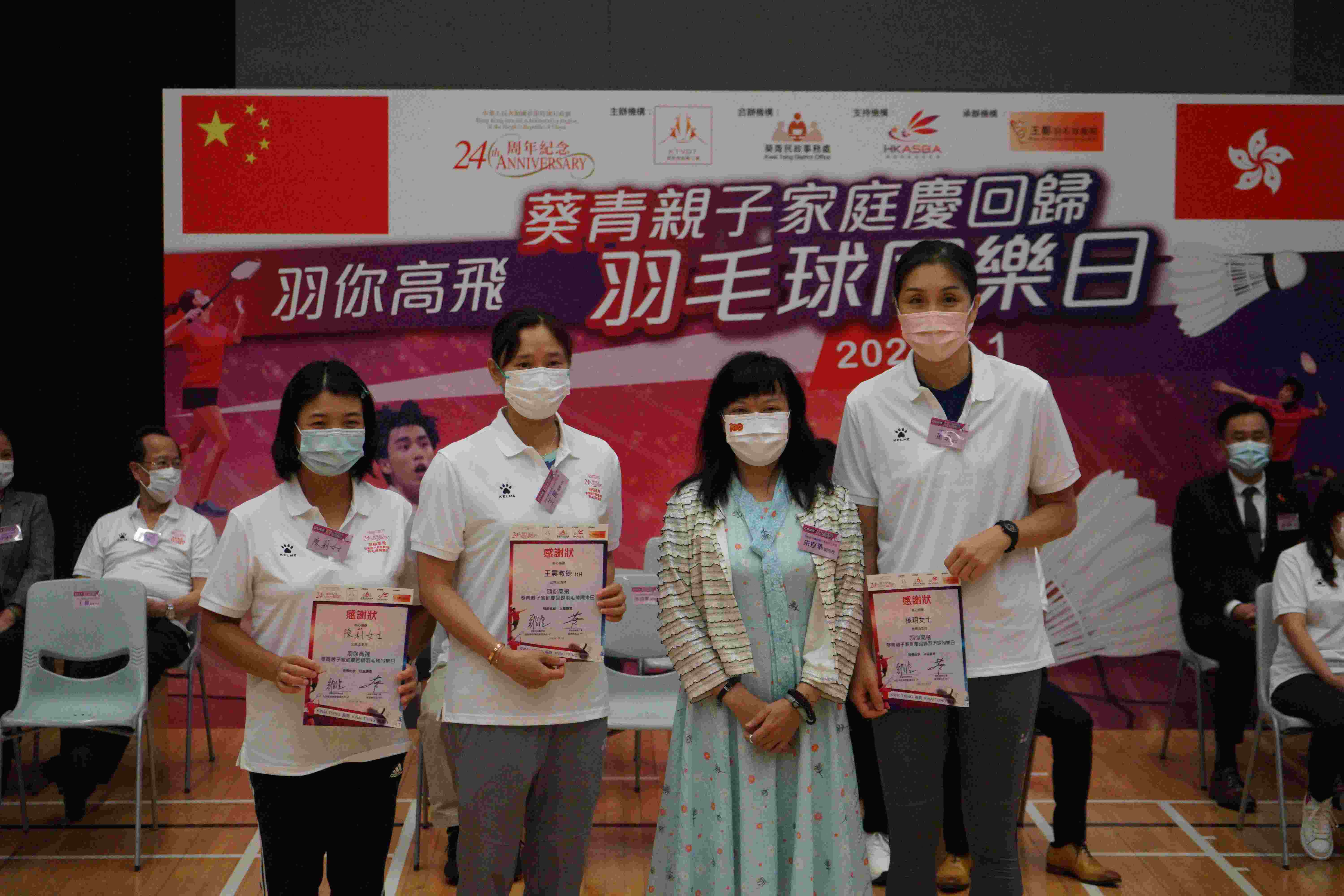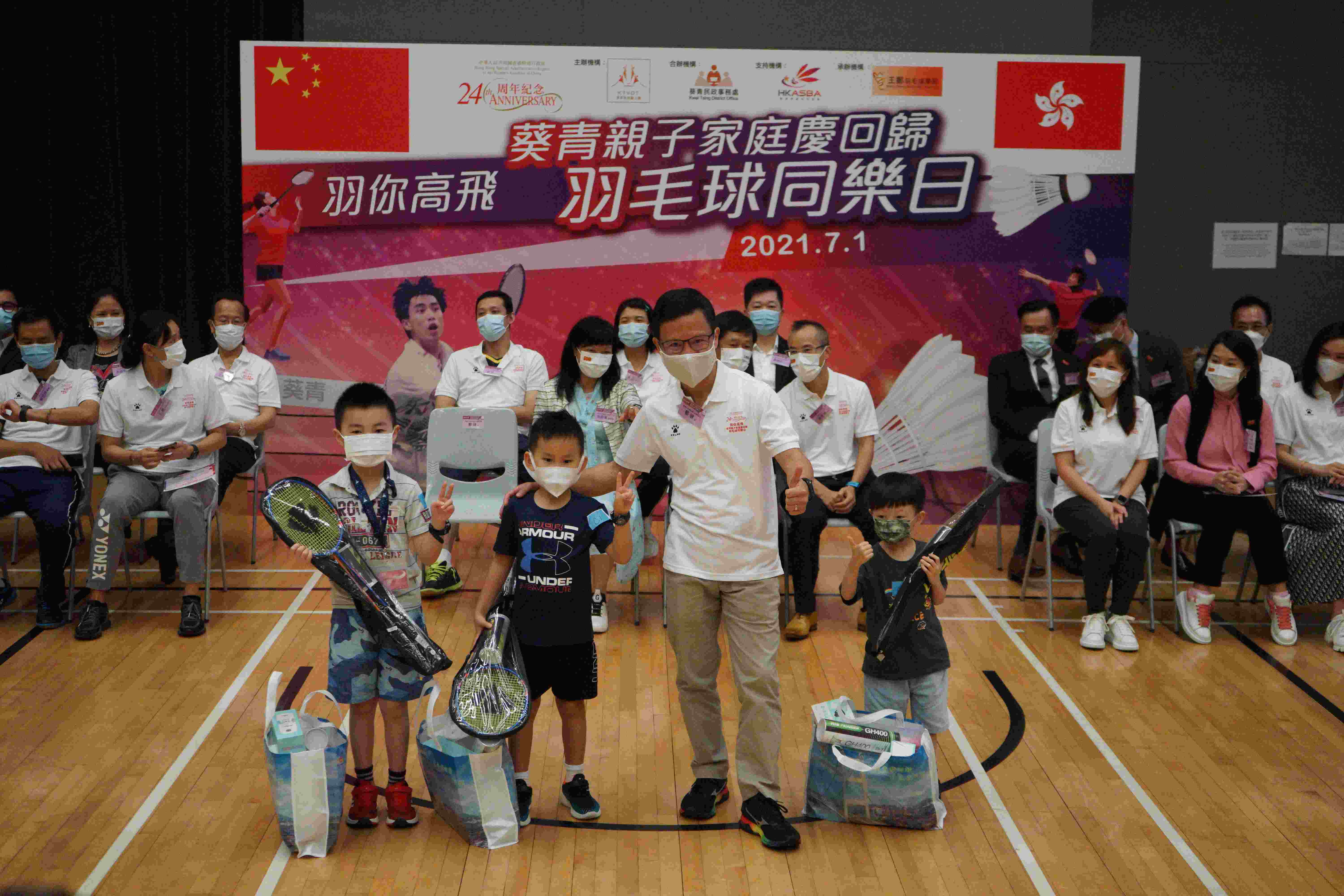 葵青發展義工團、葵青民政事務處聯合王鄭羽毛球學院1日假青衣西南體育館舉辦「『羽你高飛』葵青親子家庭慶回歸羽毛球同樂日」。新界工作部副部長朱宜華,葵青發展義工團主席葉長春,民政事務局體育專員楊德強、葵青民政事務處專員鄭健,世界男子羽毛球雙打冠軍鄭昱閩、杜哈亞運會金牌王晨、前中國女排國家隊隊長孫玥等應邀主禮。現場100個親子家庭參加,與世界冠軍共同打球玩遊戲,揮灑正能量。
