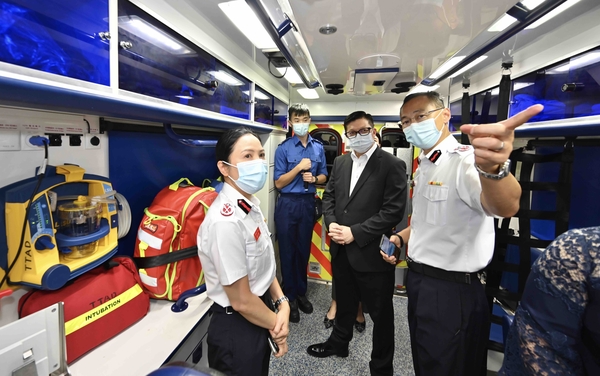 鄧炳強其後到訪尖東消防局視察局內消防和救護裝備,同時了解消防處如何運用科技優化緊急服務;鄧炳強還與處方人員交流,了解其工作情況。