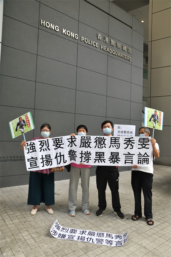 民間團體「香港勵志總會」今日(18日)到灣仔警察總部抗議,批評香港律師會理事參選人馬秀雯,曾在美國報章發表抹黑及煽動仇恨香港警隊言論,虛構所謂「警察」造謠惑眾,她更曾現身西九龍法院聲援黑暴,自稱政治中立,瞞騙公眾。
