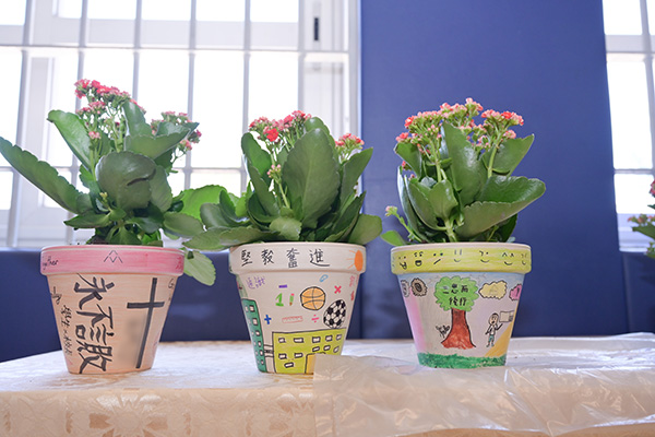 青少年在囚人士在校長及義工們的協助下,在花盆上繪畫及寫上文字。