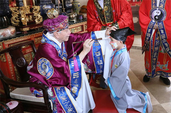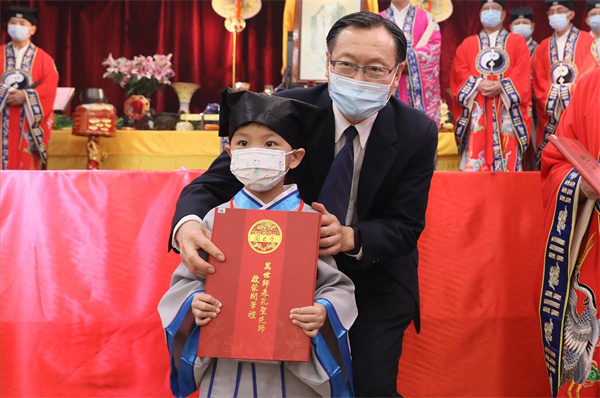 眾學子在儀式尾聲向先師行三跪九叩禮,隨後進入麟閣向孔聖先師上香及敬拜行禮;李耀輝(義覺)道長於麟閣內逐一以硃砂點痣於學童額頭正中,寓意為孩童開啟智慧、從此眼明心亮。