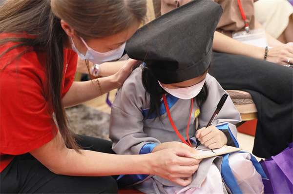 嗇色園在儀式上安排老師教導學子執筆書寫「人」字,這1撇1捺就好比學習、應相互支持,學會做個頂天立地、堂堂正正的人。