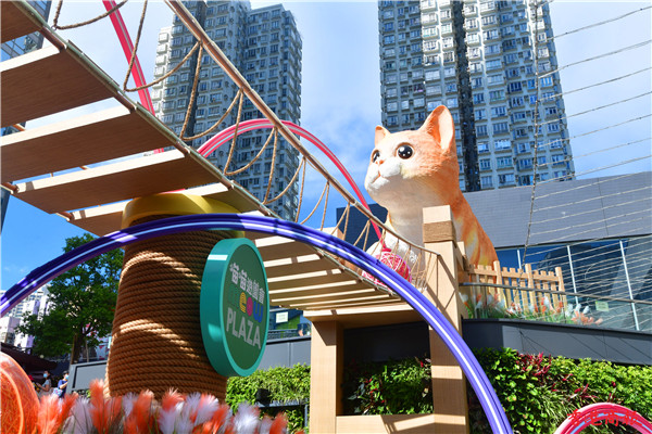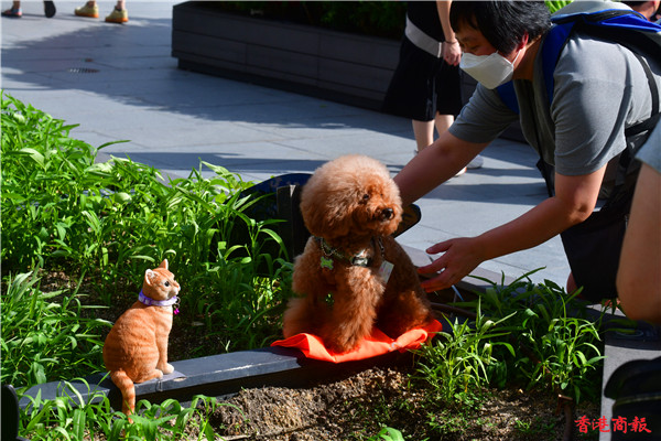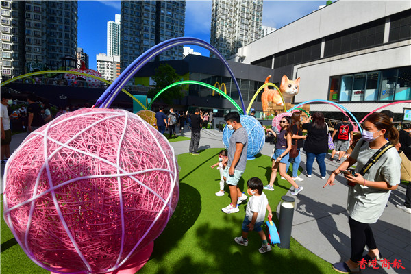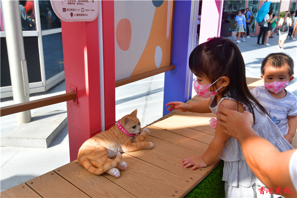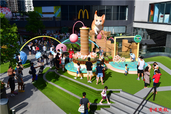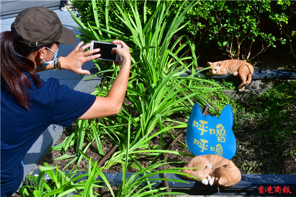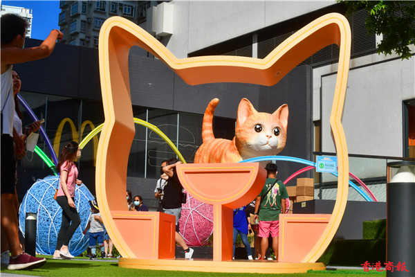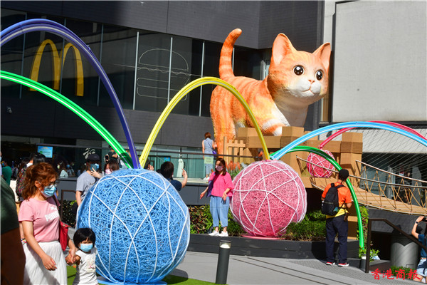 除了巨型貓裝置外,更有二十五隻不同百態、可愛的小貓裝置躲在花園不同角落,吸引不少人抱起喵星人聚首「打卡」,有瞇着眼、坐着睡着及步行中的小貓,像真度極高,配上四周七彩布幕的毛球等裝置,趁中秋追月時,與可愛貓貓裝置「打卡」輕鬆一下。(崔俊良 攝)