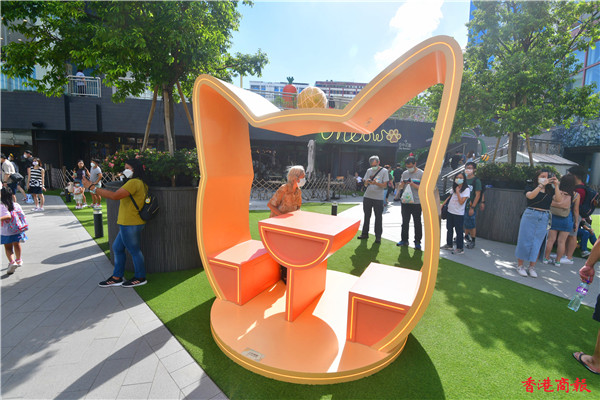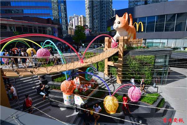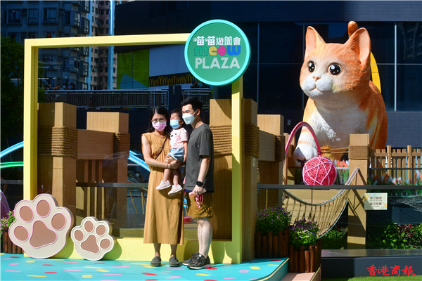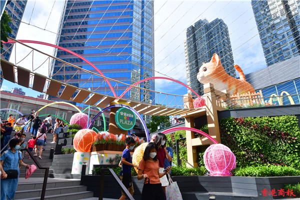 中秋節多區的大月亮、燈飾裝置都吸引大批市民湧至「打卡」應節,其中一個全城焦點是巨型喵星人登錄葵芳新都會廣場空中花園內。近日有一隻五米高超萌的大肥貓「碌碌」駐場,這隻可愛貓貓不論神緒、形態、毛色及眼神都像真度十分高,圓圓肥大的面龐及身型,準備步過一條十六米長的「喵之秋橋」動態,吸引不少愛貓者也前來這廣場抓住這一刻。