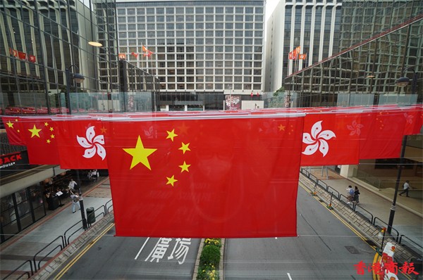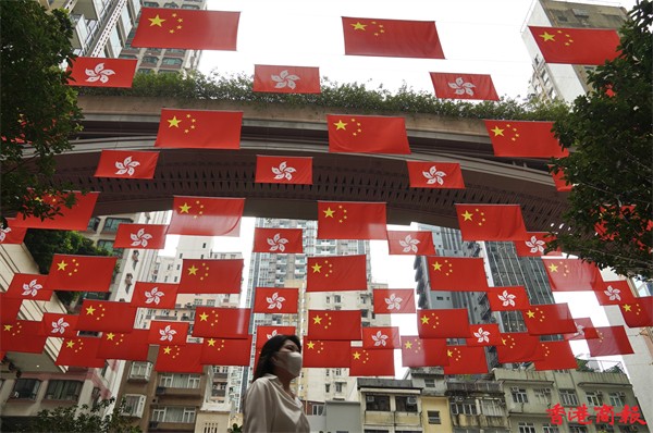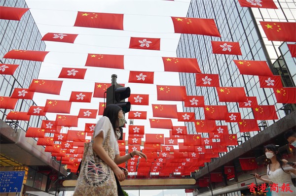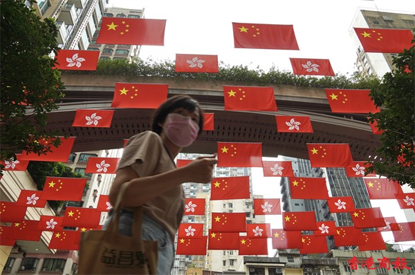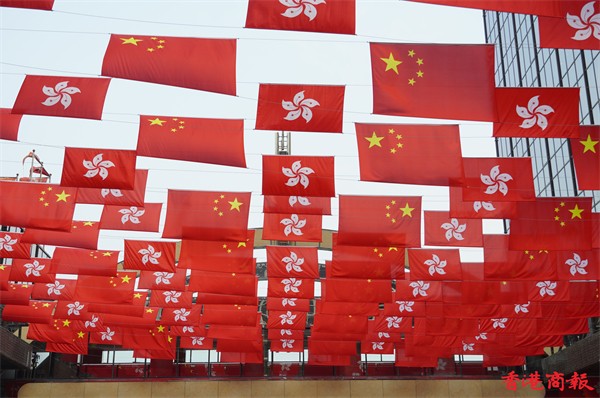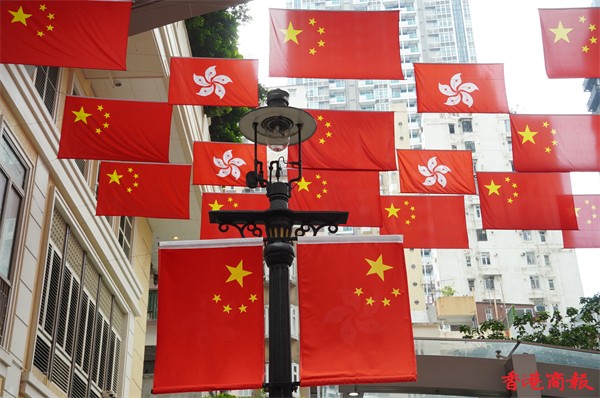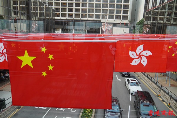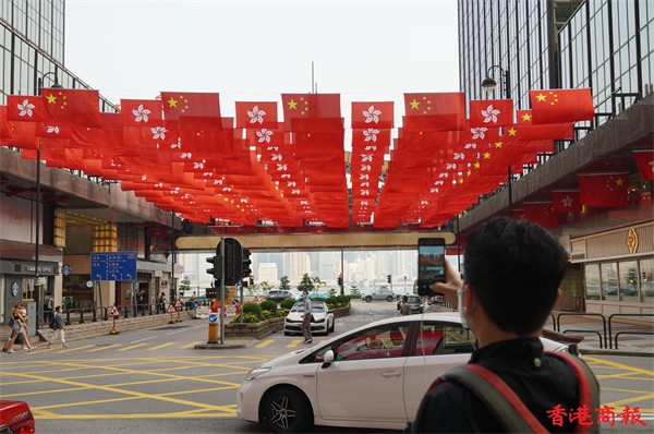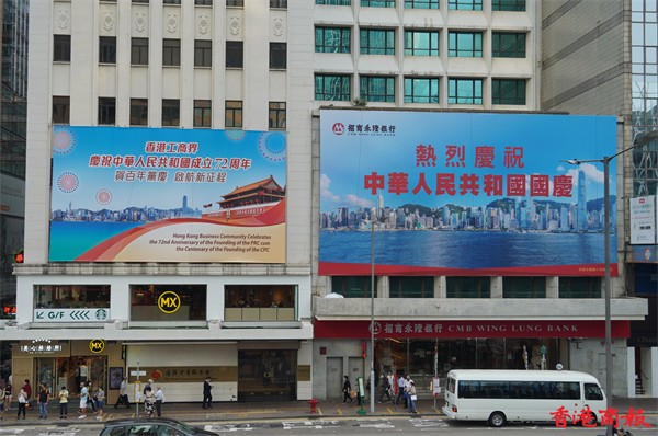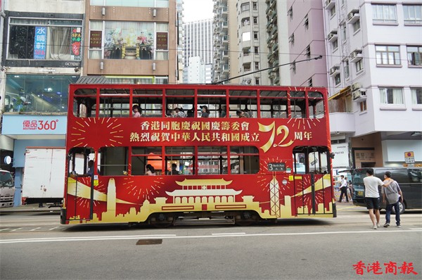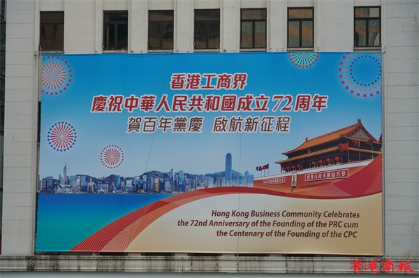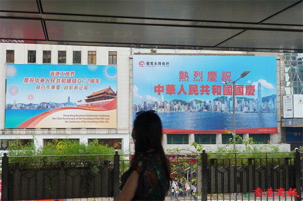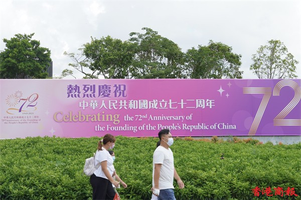 為慶祝中華人民共和國成立七十二周年,香港大街小巷近日張燈結綵,節日喜慶氣氛瀰漫。在人來車往的街道,四處可見掛着國旗、區旗及國慶標語,市民在濃濃的慶賀氣氛下,十分期待一系列的慶祝活動。