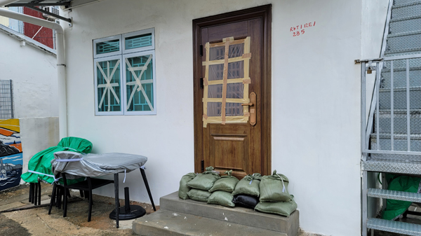 馬環村居民堆放沙包在門外。