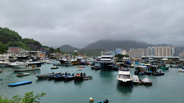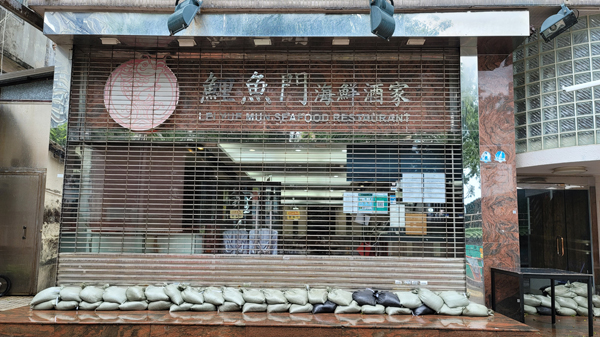 鯉魚門食肆堆放沙包在門外,船隻都泊進避風塘。