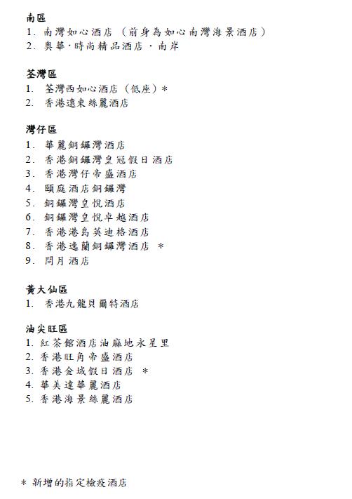 港府發言人表示,政府於9月24日發信邀請約2000間持有效牌照的酒店或旅館申請為第6輪指定檢疫酒店,共收到45個申請,經評估後,揀選40間作為第6輪指定檢疫酒店,共提供約11500間不同種類和價格的房間,供從內地及澳門以外地區抵港人士選擇入住,名單中包括35間屬第五輪指定檢疫酒店。