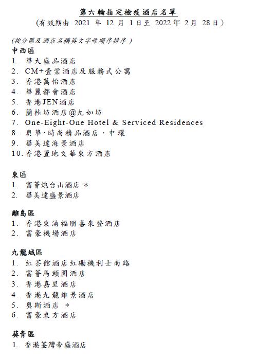 港府今日(19日)公布第6輪指定檢疫酒店的名單。由今年12月1日至明年2月28日的新一輪指定檢疫酒店計劃共涵蓋40間酒店,提供約11500間房間,政府可在有需要時調整這一輪計劃所提供的房間數目。