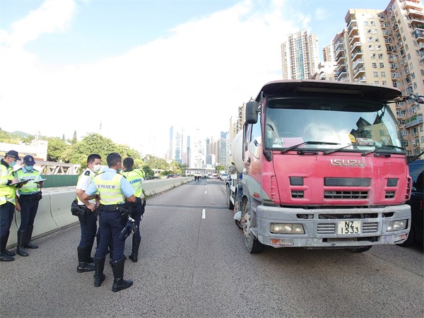 受意外影響,葵涌道往荃灣方向近美孚新邨部分行車線封閉,現場交通繁忙。(記者 區天海)