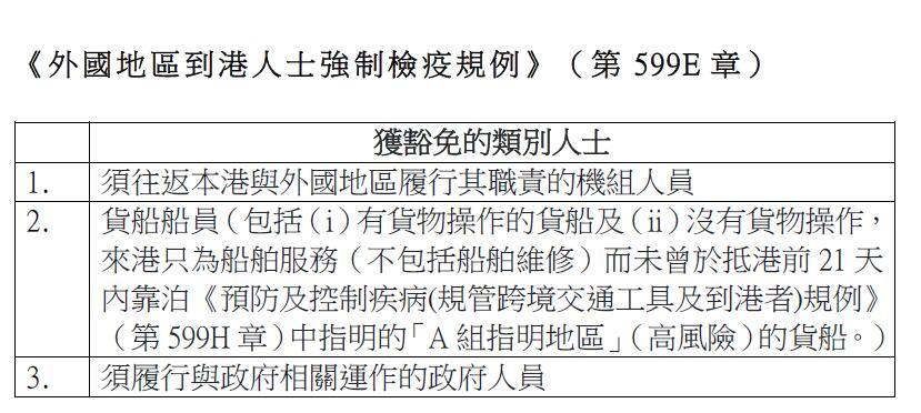 為了維持香港必須的社會及經濟運作,並確保市民生活所需不受影響,政府在《若干到港人士強制檢疫規例》(第599C章)及《外國地區到港人士強制檢疫規例》(第599E章)下,豁免部分符合相關條件的人士到港後接受強制檢疫。條件包括該類別人士進入香港是對香港正常運作、政府事務運作、保障香港的人的安全或健康屬必要或符合香港的公眾利益等。現時,在第599C章及第599E章下分別有36類及12類到港人士符合相關條件,獲豁免檢疫。