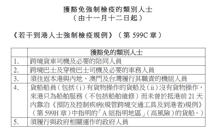 由11月12日起,政府將取消絕大部分豁免類別人士到港後豁免接受強制檢疫的安排,只保留維持香港社會運作及市民生活所需的豁免類別,包括跨境貨車/巴士司機、航機機組人員、在香港裝卸貨物的貨輪上的船員、政府人員等。