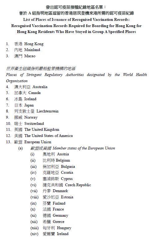 發言人表示,政府對海外抵港人士入境實施嚴格防控措施,要求於登機當天或之前21天曾逗留A組指明地區的人士,必須為已完成疫苗接種並持認可疫苗接種紀錄的香港居民方可登機來港。認可疫苗接種紀錄包括由香港發出的疫苗接種紀錄、由內地或澳門當局或其認可機構發出的疫苗接種紀錄、由經世界衞生組織指明當地監管機構為嚴格監管機構的國家的相關主管當局,或其認可機構發出的疫苗接種紀錄,或香港與當地政府達成認可安排,而由相關主管當局或其認可機構發出的疫苗接種紀錄。