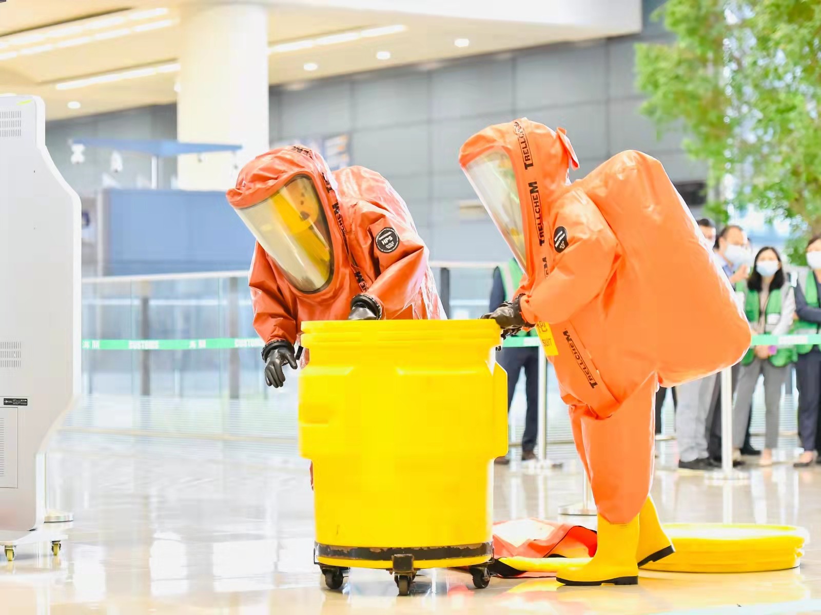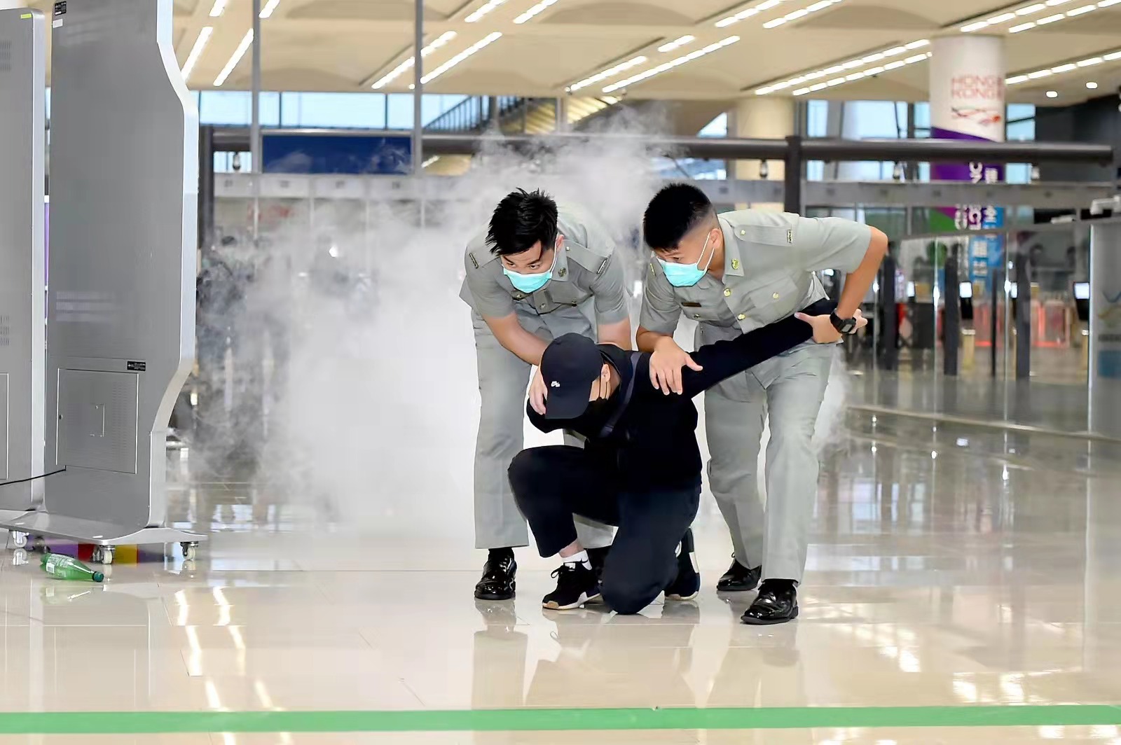 第二部分則模擬一名激進分子在旅檢大樓進行生化襲擊,海關人員成功制服施襲者及有效啓動緊急應變計劃,安全有序地疏散在場人士。而消防處人員於接報後迅速到場救援和處理有害物質。