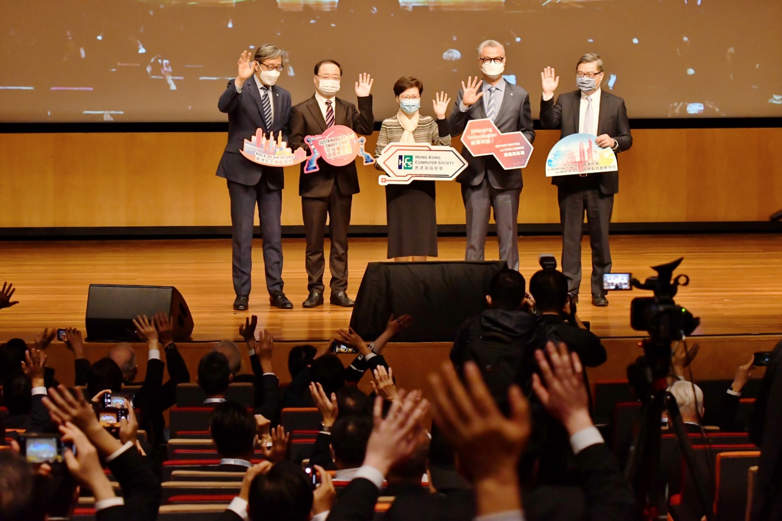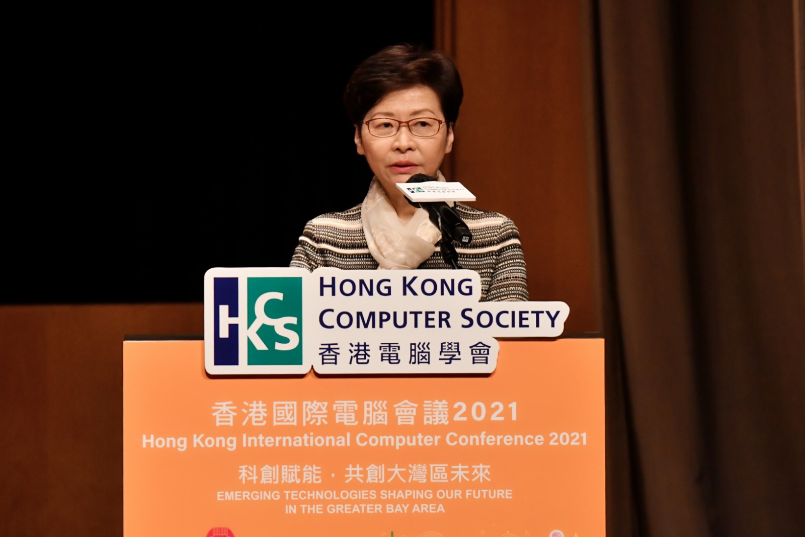 林鄭致辭時表示,中央「十四五」規劃中首次為香港多方面發展創科提供明確支持,特區政府過去四年間投放超過1300億元於創科發展,成果令人鼓舞。她說,在過去兩年,粵港澳大灣區能夠為初創企業等多方面提供動力,期望大灣區能夠發展成國際創科中心,香港亦會從中扮演重要角色。