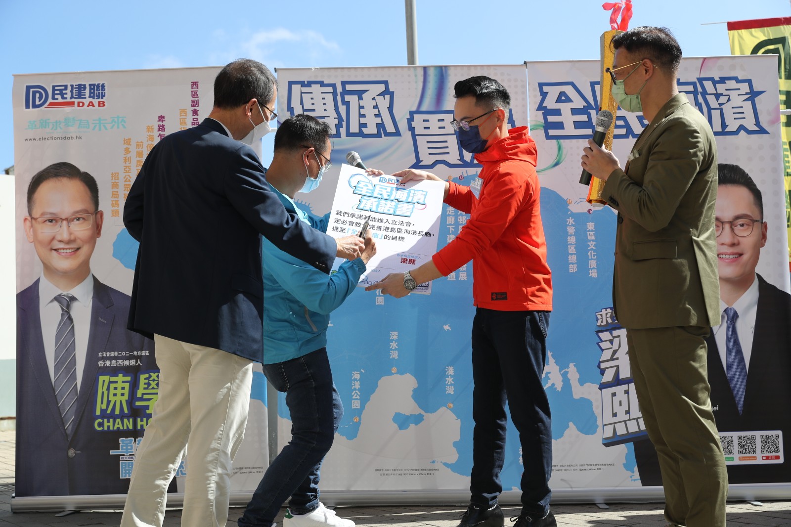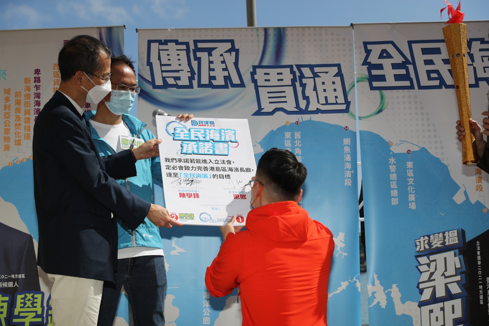 民建聯今日(20日)舉行「傳承 貫通 全民海濱活動」,立法會參選人陳學鋒和梁熙在選委會界別候選人張國鈞見證下簽署承諾書,承諾若能進入立法會,定必致力完善港島區海濱長廊,達至「全民海濱」。