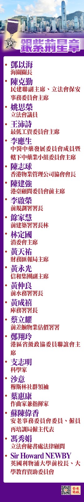 獲頒金紫荊星章的18人來自多個界別,如政界、司法界及法律界等,包括前海關關長鄧以海、國安法指定法官楊振權、身兼行會成員的工聯會立法會議員黃國健、西九管理局行政總裁馮程淑儀、前刑事檢控專員江樂士,及基本法委員會委員陳弘毅等。另有41人獲銅紫荊星章。