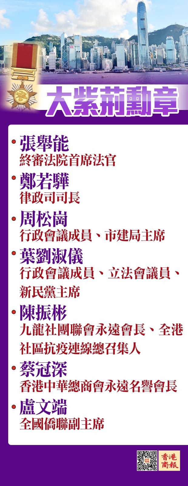 獲頒大紫荊勳章的7人,包括終審法院首席法官張舉能、律政司司長鄭若驊、市建局主席周松崗、新民黨主席葉劉淑儀、九龍社團聯會永遠會長暨全港社區抗疫連線總召集人陳振彬、香港中華總商會永遠名譽會長蔡冠深及全國僑聯副主席盧文端。