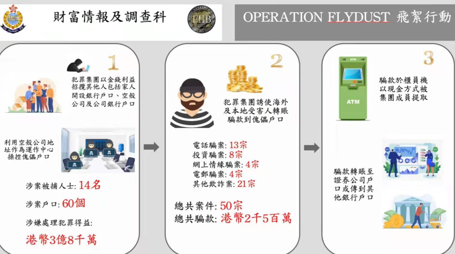 財富情報及調查科財富調查組總督察鄧凱彤今日(23日)表示,根據情報及深入調查,得悉一個洗黑錢集團招攬包括家人在內的人士,開設傀儡戶口和公司銀行戶口,收取本港和外地詐騙案得來的犯罪得益,以及利用戶口互相轉賬清洗黑錢,涉嫌在2020年4月至本年10月期間,利用最少60個銀行戶口處理3.8億元犯罪得益,當中部分款項涉及50宗騙案,包括電話、電郵、網上情緣、投資和其他騙案,受害人被騙取約2500萬元。