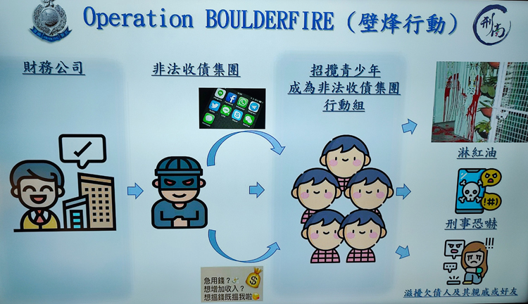 庾博瀚指出,受害人早前在不同渠道借貸,其後因無法償還,受到收債「行動組」不同程度的滋擾,開始時是恐嚇來電和短訊,其後住所和工作地點被淋油漆和張貼收債字條,當中寫有中文全名、身份證號碼和欠債金額等。調查顯示,收債集團由不同黑社會在背後操控,最高金額一宗欠債約數十萬元,涉及財務公司,而被捕人士中10名為青少年,他們獲每宗欠債個案收取數千元報酬,負責不斷向同一單進行滋擾,直至對方還款,與過去每宗報酬數百至1千元報酬有所不同。此外,警方得悉集團以包攬形式接受單一欠債個案,當成功收債後可瓜分金錢。(記者區天海)