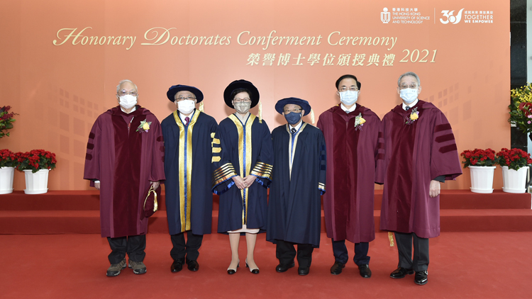 圖為行政長官林鄭月娥、科大校董會主席廖長城、科大顧問委員會主席陳祖澤於頒授儀式開始前與3位榮譽博士得獎者周永健、林高演和胡應湘合照。