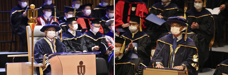 左圖為科大校董會副主席楊佳錩主持學位頒授典禮,右圖為科大校長史維於典禮上勉勵畢業生。