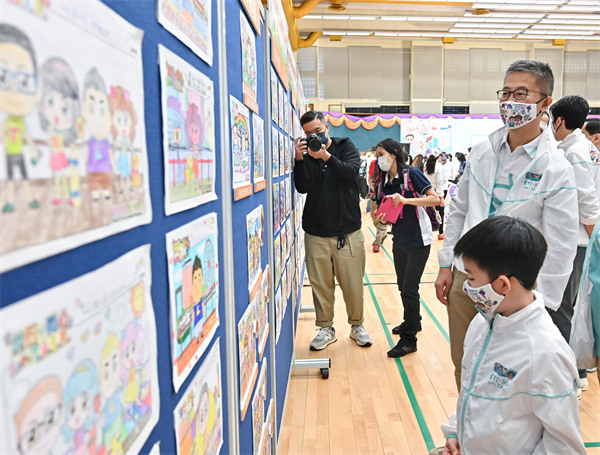 圖片說明:圖為警務處處長蕭澤頤欣賞「親子填色及口號創作比賽」的參賽作品