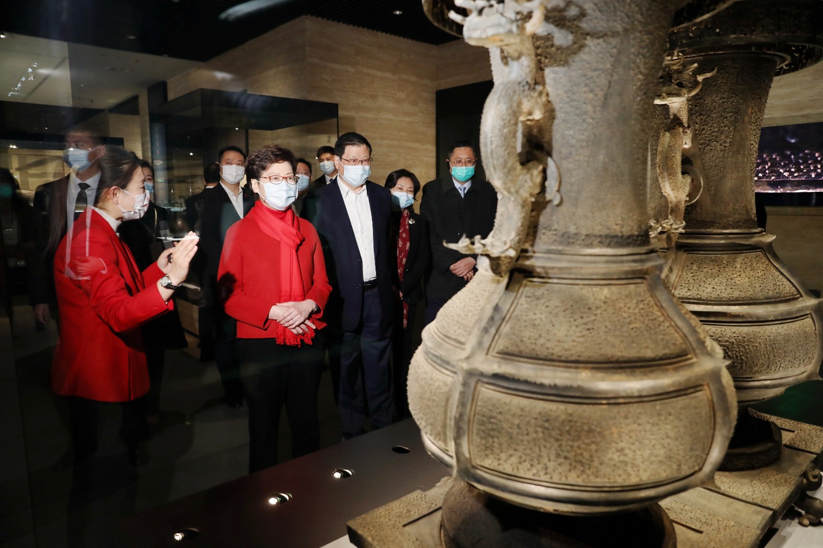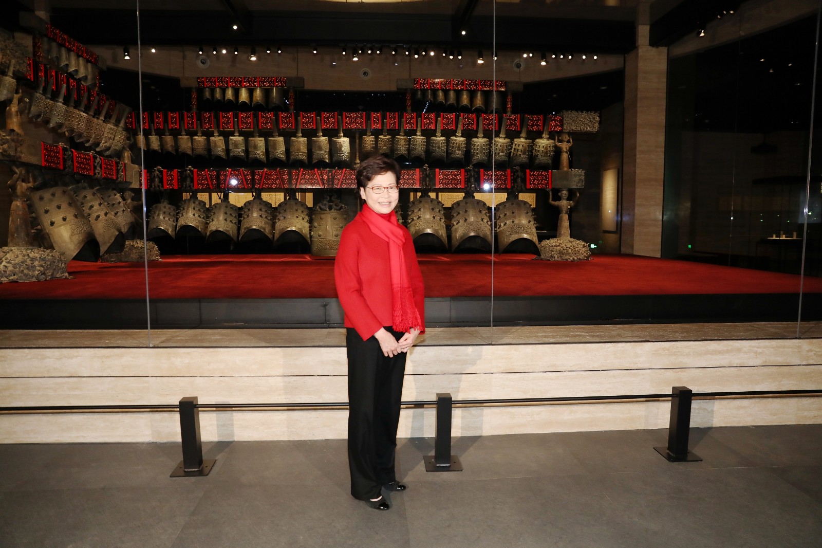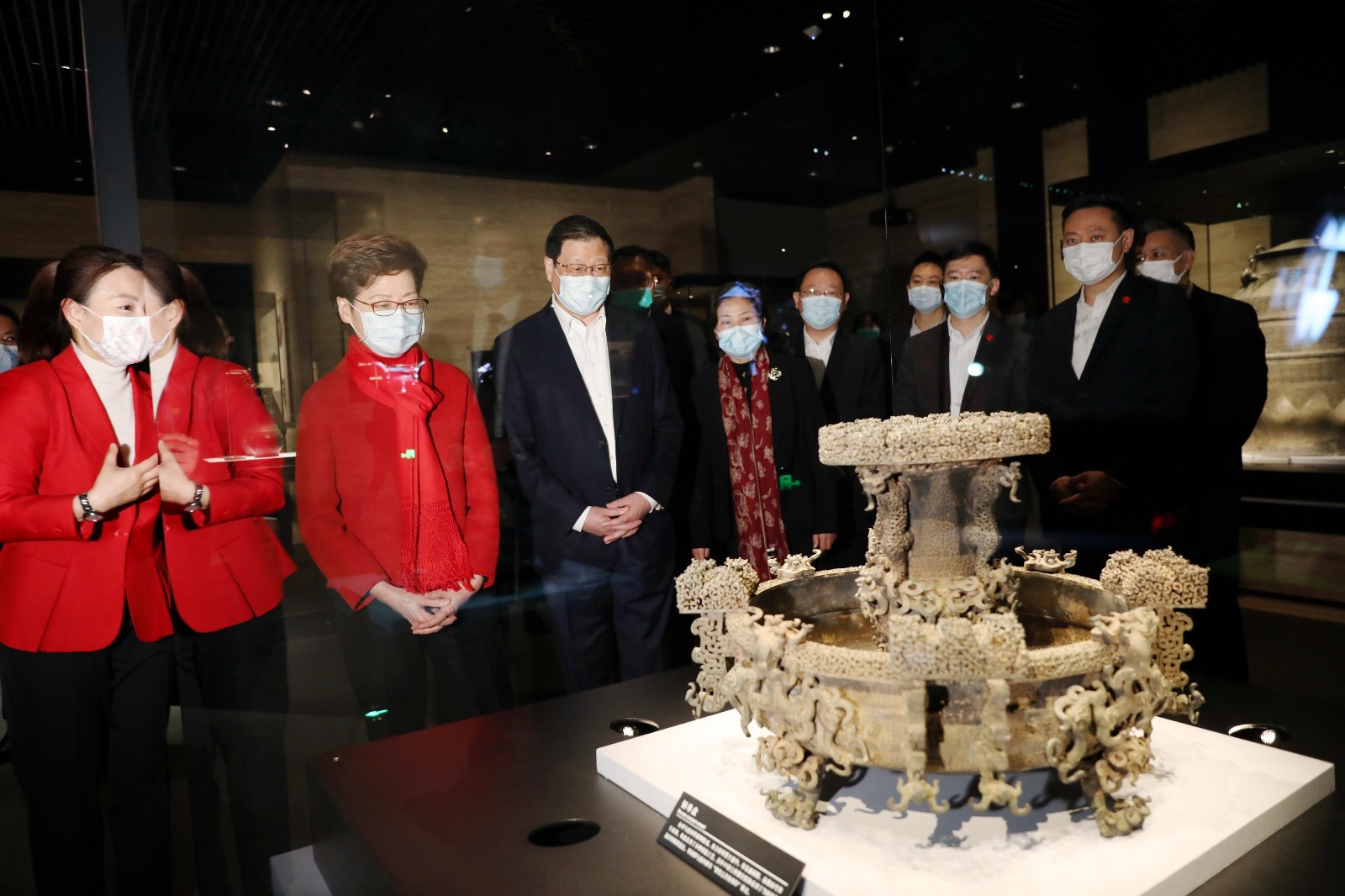 上午,林鄭在湖北省委書記應勇陪同下,到湖北省博物館新館考察當地的考古及文物保護工作。湖北省博物館是國家一級博物館,有近千件/套國家一級文物,擴建的新館本月剛竣工,總建築面積6.4萬平方米,外型獨特。林鄭月娥參觀新館的展品,包括重點藏品曾侯乙編鐘,並欣賞館方安排的編鐘演奏。她表示,香港故宮文化博物館將於明年中開幕,期望與湖北省博物館加強合作,在文物保護、珍貴藏品展覽和教育等範疇作更多交流。