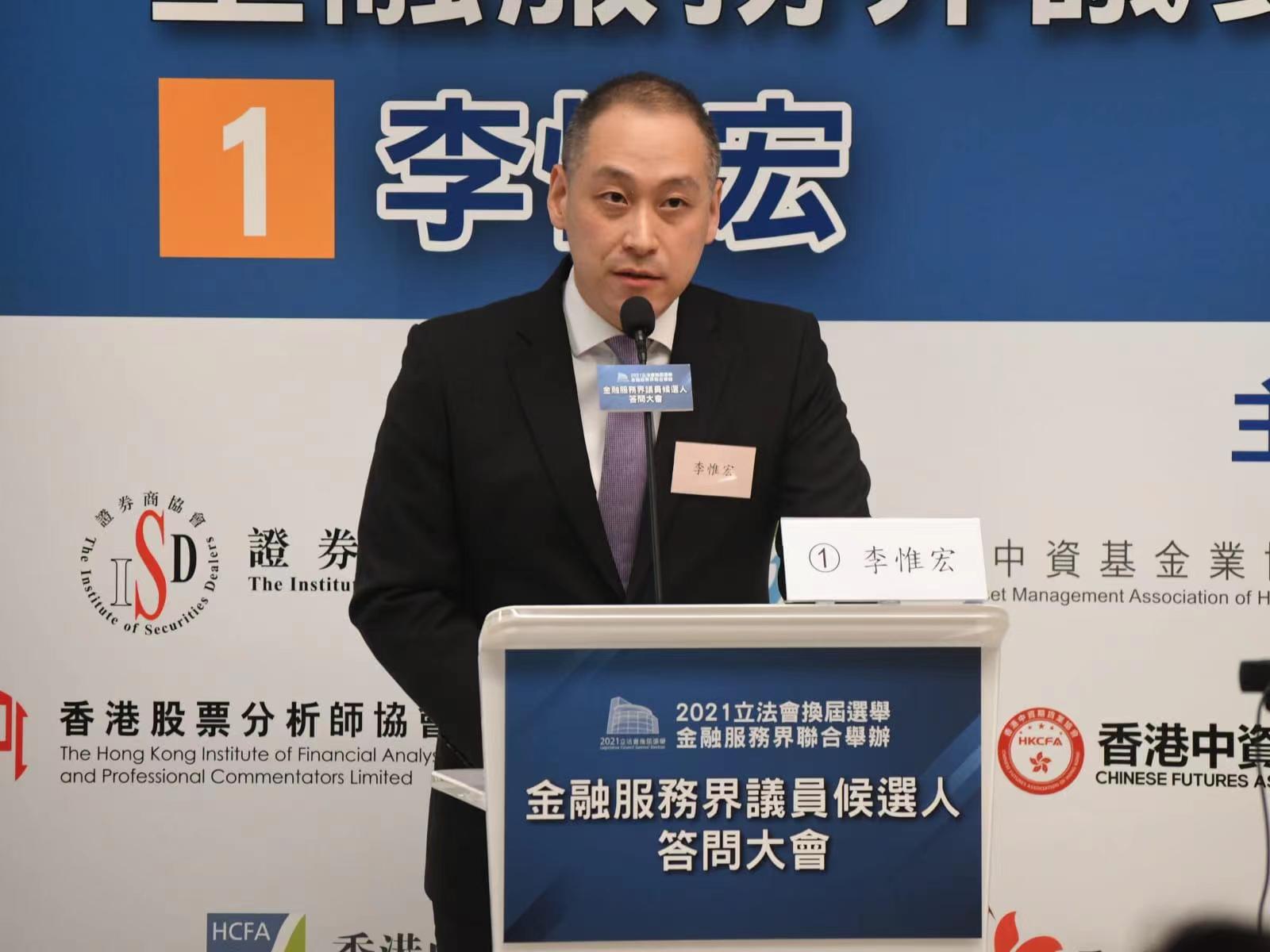 李惟宏在會上表示,過去要拜訪了不少業界代別、選民,聽取他們的意見,又認為金融服務界應該做更多事去改善,包括解決中小企的經營困難問題。他又指,今次選舉大家要選擇走過去走過的「掘頭路」,還是選一個新代表去帶領業界,若自己能當選,會帶領業界與特區政府互動,並將業界聲音帶入議會,積極、進取去為業界爭取更多機會。