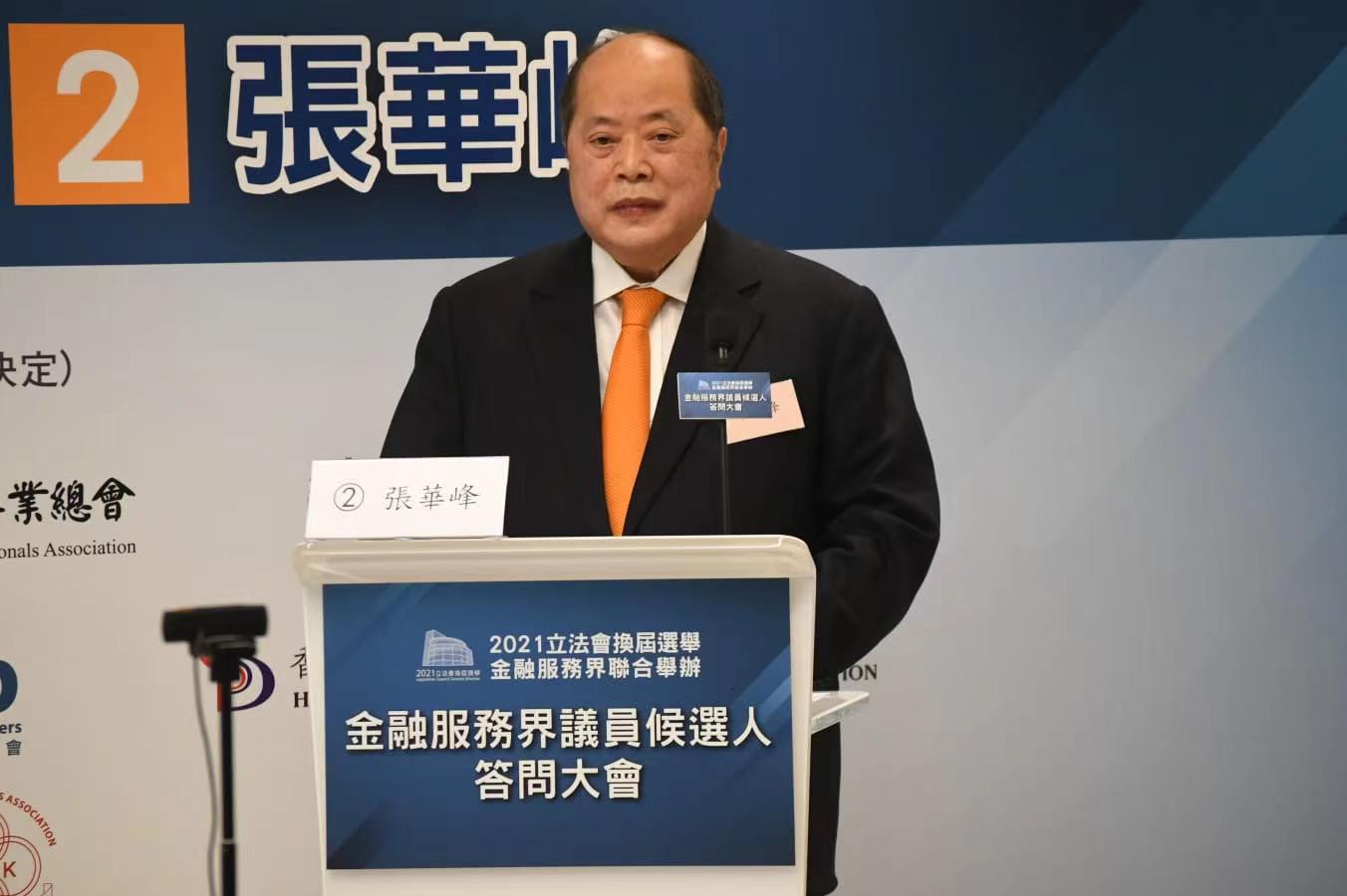 張華峰表示,感謝業界選了他在過去9年為大家服務,而今次參選政綱共分為4大範疇,包括完善上市制度,認為現時的制度落後,限制了業界發展。他又提到,會配合灣區發展,加強前海合作,為香港帶來重大機遇,以開拓灣區市場,為灣區內的市民提供服務。他續指,未來要推動金融科技、再創經濟繁榮,全力支持香港國安法的落實。他說,國家「十四五」規劃發展明確,香港必定要融入國家大循環中,積極發揮「一國兩制」的優勢。
