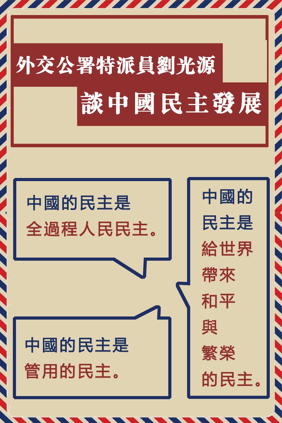 中國的民主是給世界帶來和平與繁榮的民主。中國通過堅持走符合自身國情的民主發展道路,實現了和平發展,給世界各國帶來機遇和希望。西方列強在過去400多年給人類帶來了綿延不絕的戰爭與衝突,但中國走和平發展道路,從沒有侵略過任何人,沒有推翻過任何外國政府,而是給世界帶來了繁榮穩定和公平正義。