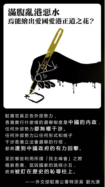 劉光源並正告外部干預勢力,香港實行什麼樣的選舉制度是中國的內政,以任何形式和幌子干涉香港立法會選舉,都將遭到中國政府的有力回擊。那些利用所謂「民主峰會」之機抹黑香港、詆毀國家的跳樑小丑,終將被釘在歷史的恥辱柱上。「螞蟻緣槐誇大國,蚍蜉撼樹談何易。」任何反華勢力都無法阻擋香港由亂轉治、由治及興的歷史大勢。(外交部駐港公署資料圖)