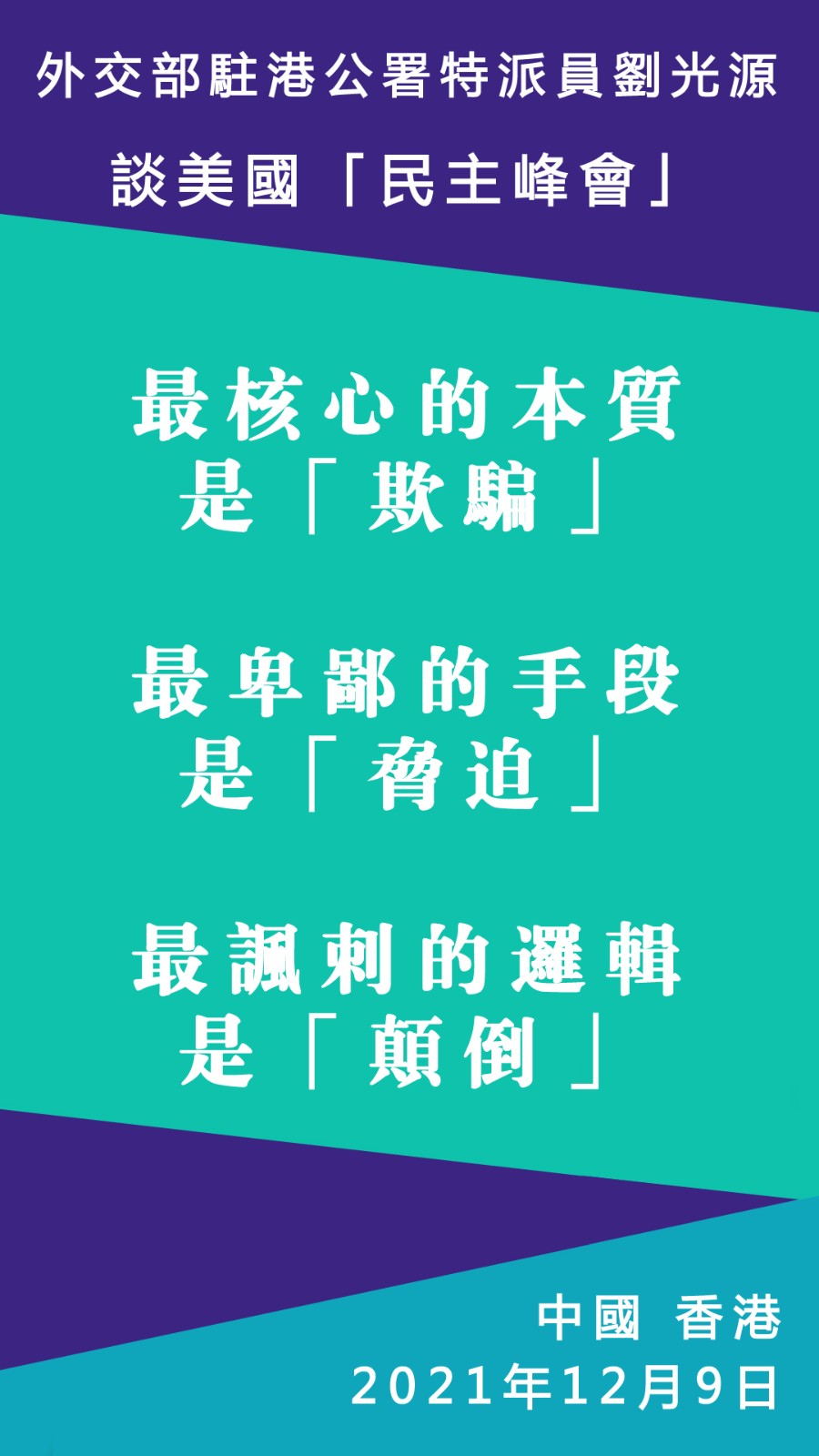 在美國舉行所謂「民主峰會」前夕,香港中聯辦聯同外交部駐港公署今日(9日)舉辦「透視民主真諦、堅定民主自信」座談會,邀請香港各界知名人士出席。外交部駐港公署特派員劉光源致辭時指出,美國「民主峰會」最核心的本質就是「欺騙」,最卑鄙的手段是「脅迫」,最諷刺的邏輯是「顛倒」。他表示,中國開闢了充滿活力的民主發展道路,中國的民主是全過程人民民主,中國的民主是管用的民主,中國的民主是給世界帶來和平與繁榮的民主。