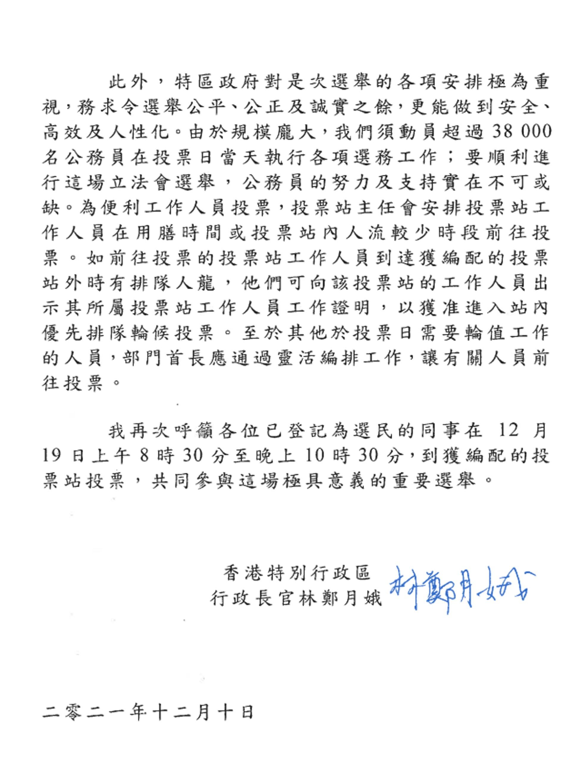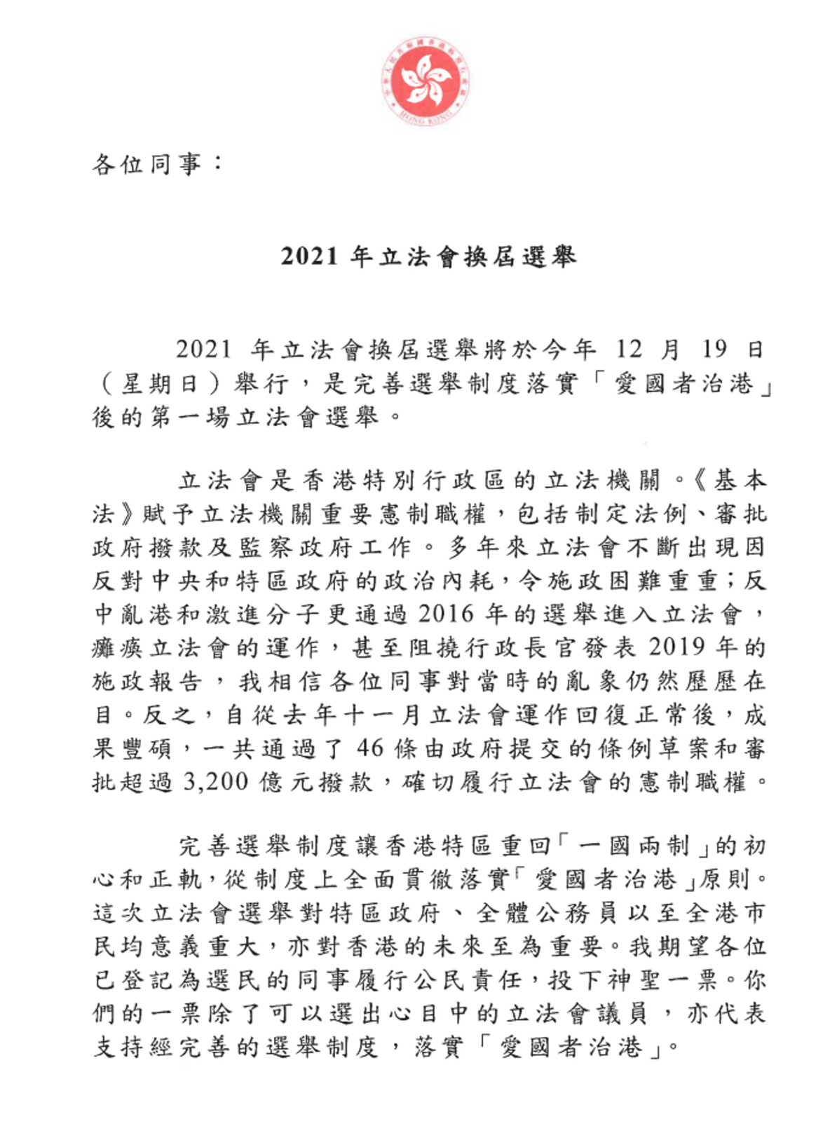 林鄭強調,完善選舉制度讓香港特區重回「一國兩制」的初心和正軌,從制度上全面貫徹落實「愛國者治港」原則,「這次立法會選舉對特區政府 、全體公務員以至全港市民均意義重大,亦對香港的未來至為重要。」她期望已登記為選民的公務員履行公民責任,投下神聖一票。