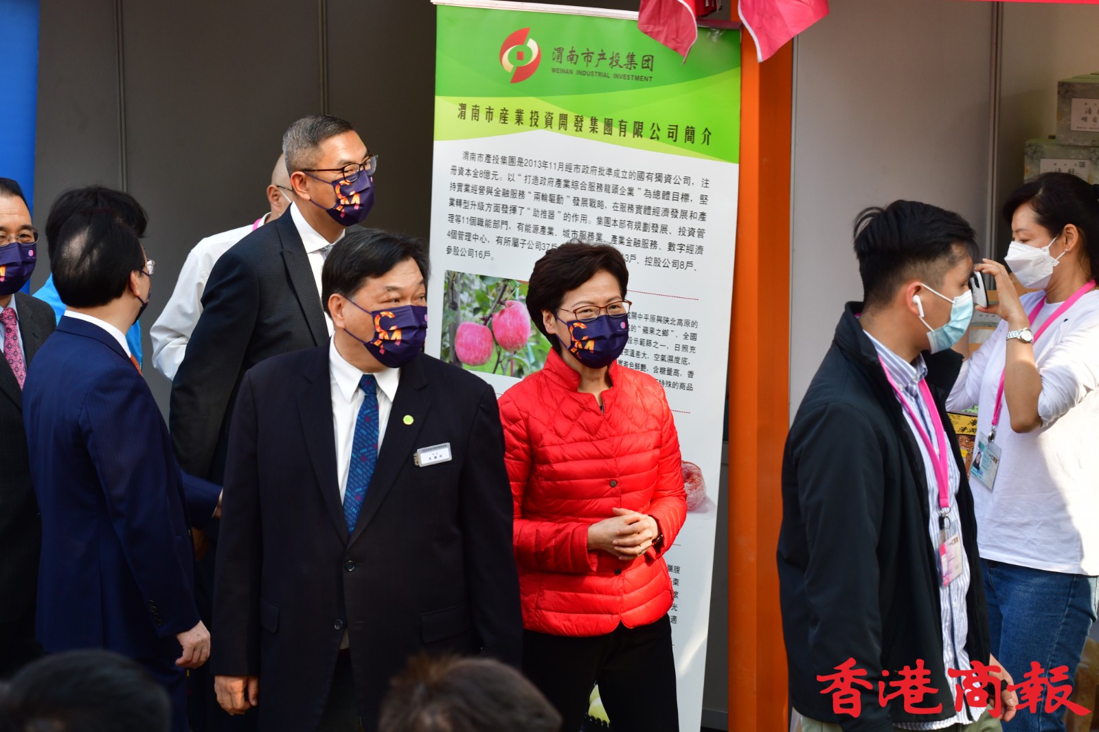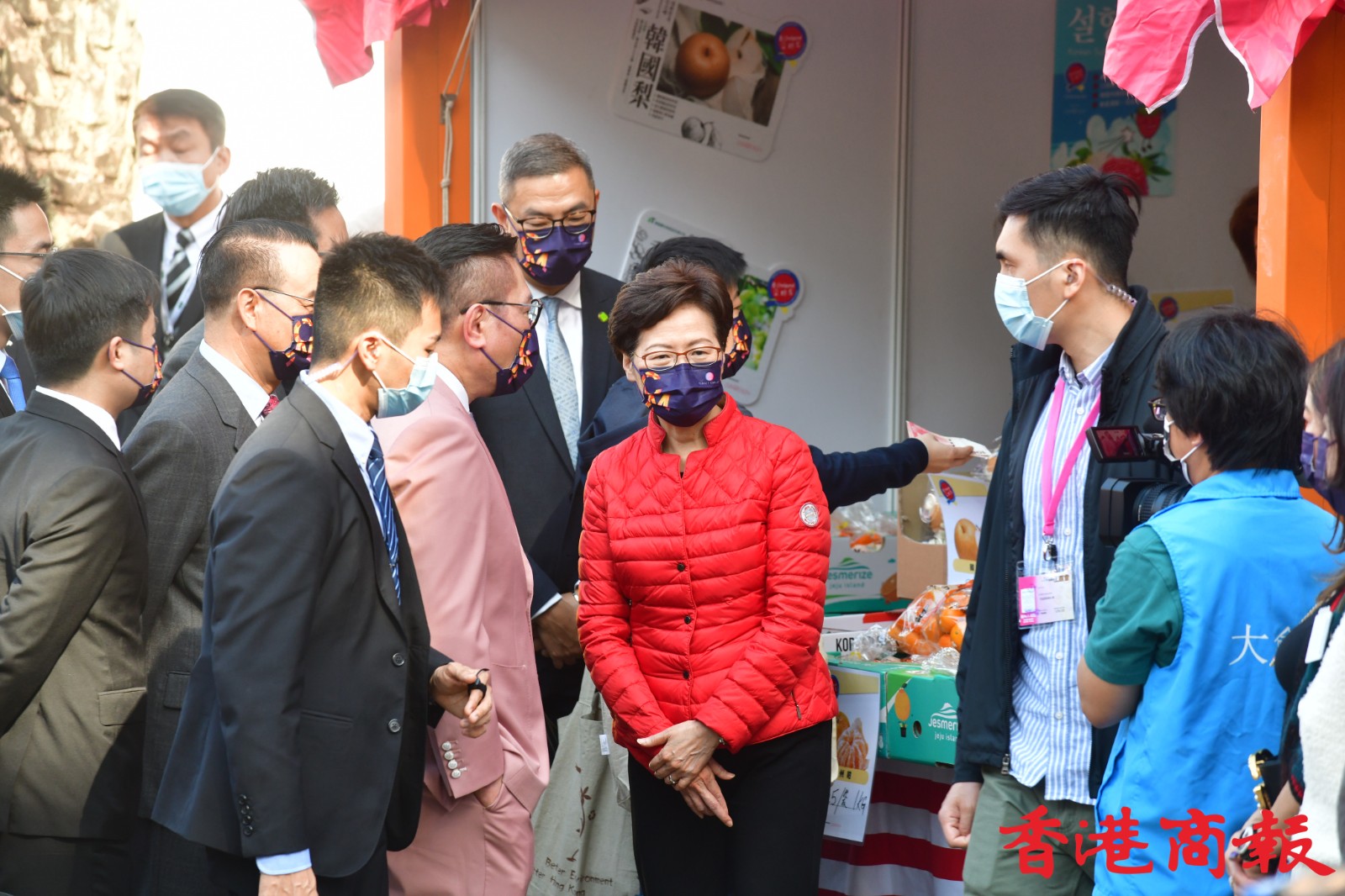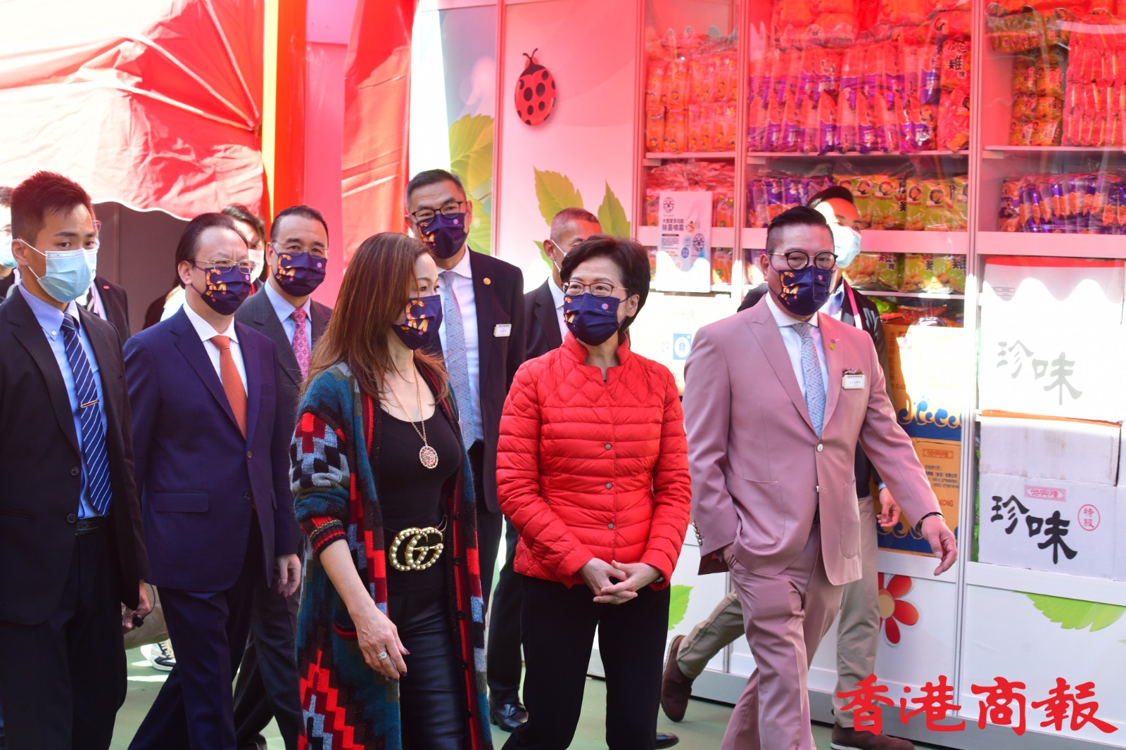 其後,林鄭與譚鐵牛、劉光源,以及多名官員在香港中華廠商聯合會會長史立德陪同下,一同視察工展會攤位。林鄭花逾5000元購買了蝦子麵、臘肉、鮑魚麵、即食鮑魚等食品,她還與商戶交流,祝賀對方生意興隆。民政事務局局長徐英偉拉着手拉車,更是滿載而歸。