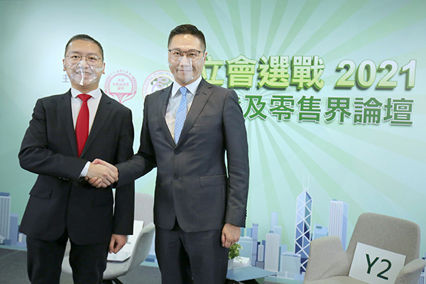 立法會選舉2021(批發及零售界功能界別)候選人林至穎及邵家輝出席香港化粧品同業協會及港九電器商聯會聯合主辦的批發及零售界論壇。