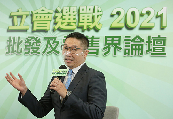 立法會選舉2021(批發及零售界功能界別)候選人邵家輝出席香港化粧品同業協會及港九電器商聯會聯合主辦批發及零售界論壇。