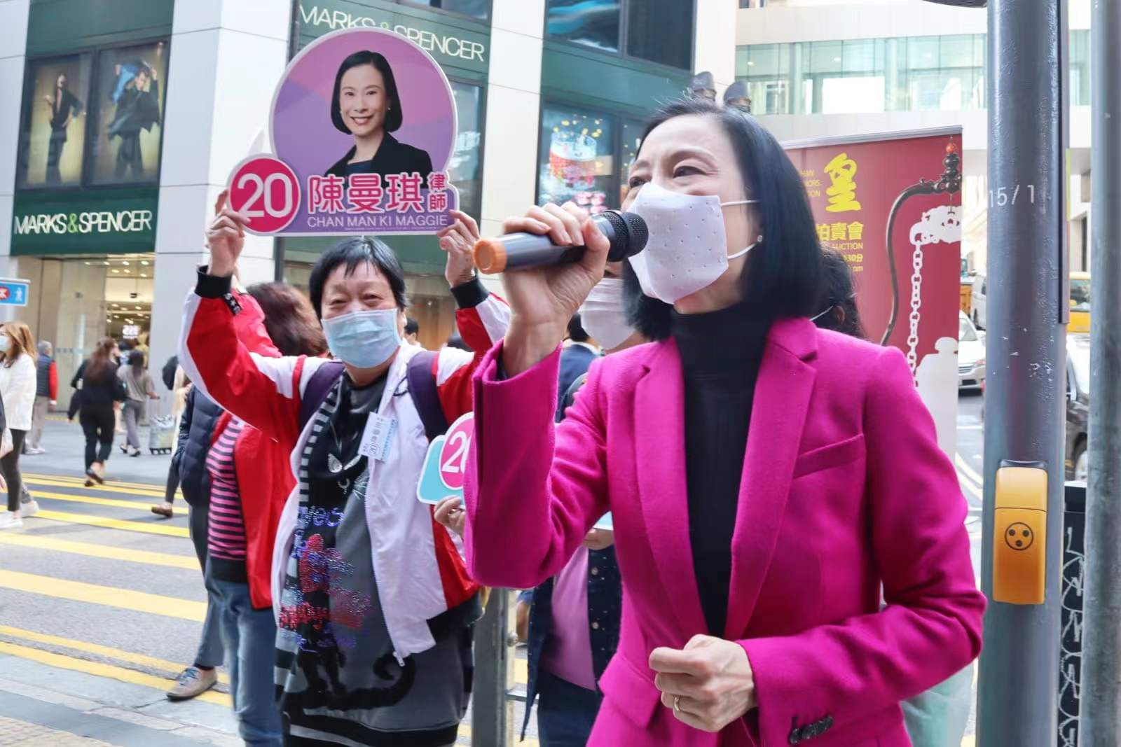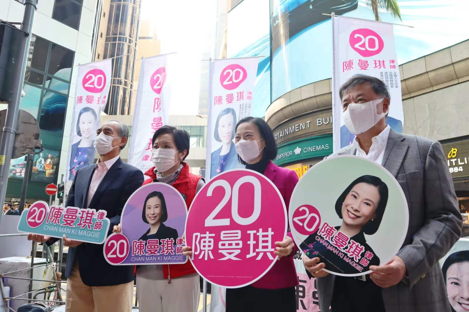 選委會界別候選人陳曼琪今日(14日)於中環擺設街站,呼籲各界選民在立法會投票日踴躍投票,獲全國人大代表、全國婦聯、地區人士等到場支持。