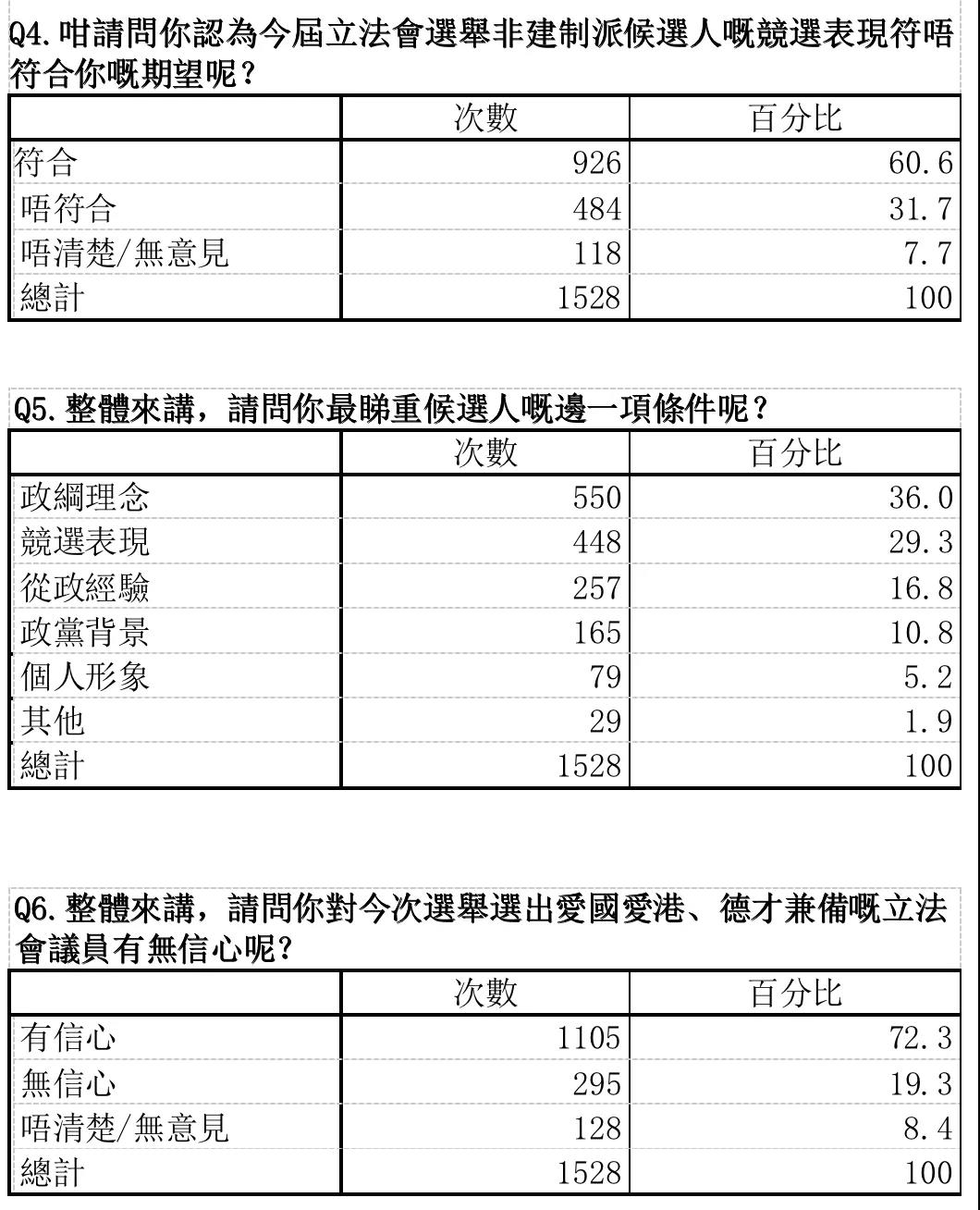 對於建制和非建制候選人表現,68.4%選民認為建制候選人表現符合預期,23.5%認為不符合,8.1%表示不清楚、無意見。60.6%選民認為非建制候選人表現符合預期,31.7%認為不符合,7.7%表示不清楚、無意見。結果表明,建制和非建制候選人競選表現均獲不少選民認可,預計許多席位到最後才能分出勝負。