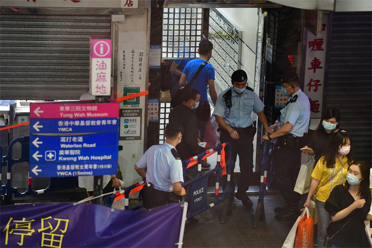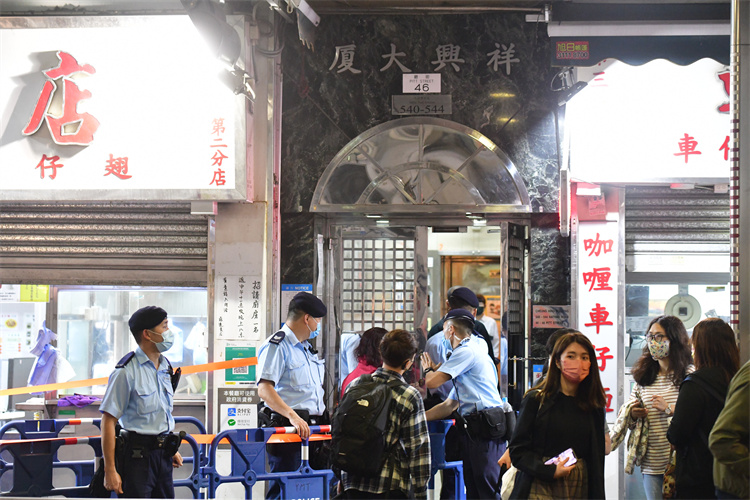 圖:彌敦道540號祥興大廈晚上圍封情況。 崔俊良攝
