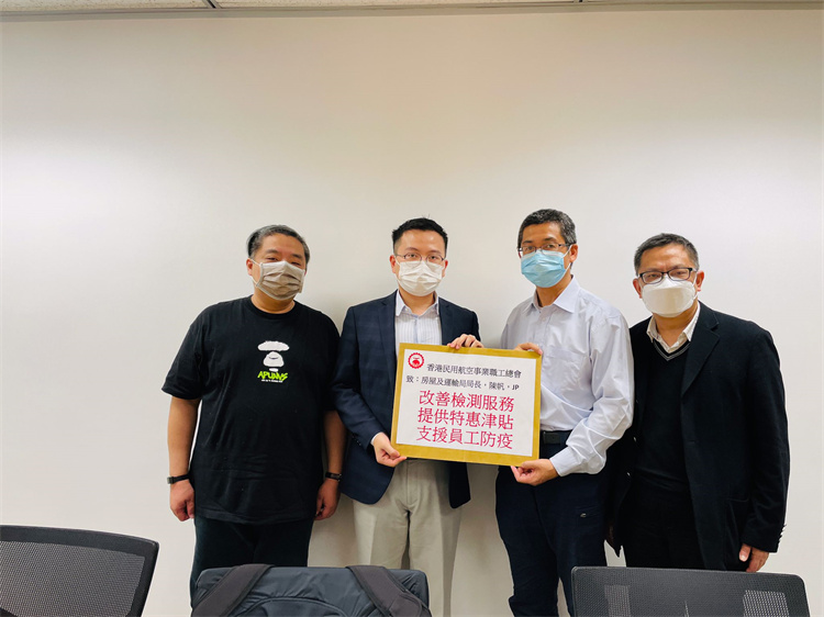 香港民用航空事業職工總會今日(17日)約見機管局營運總監李佳惠和運輸及房屋局政治助理符傳富,工會主席李永富歡迎政府按要求於航膳區增設檢測點並延長服務時間,惟現時要求特定機場工作人員須進行2日1檢,機場檢測站設施未能滿足需求,因此促請政府於機場跑道尾維修區增設檢測點並建議部分服務點應根據需要改為24小時服務。