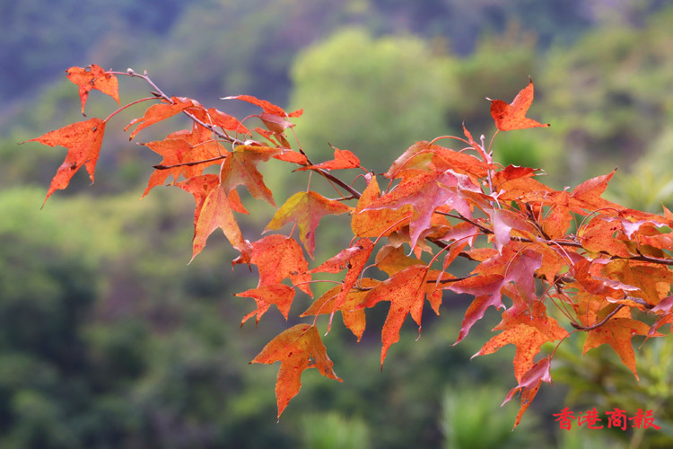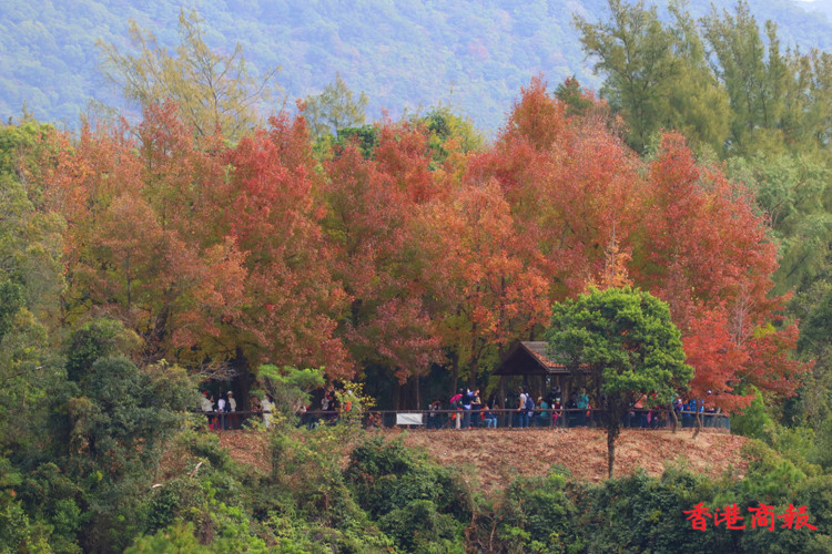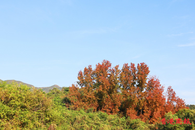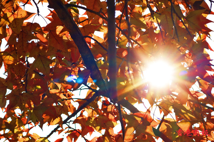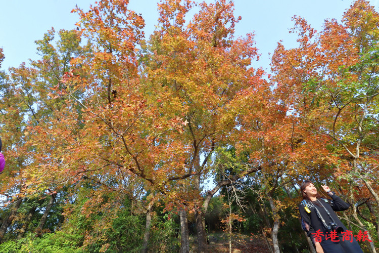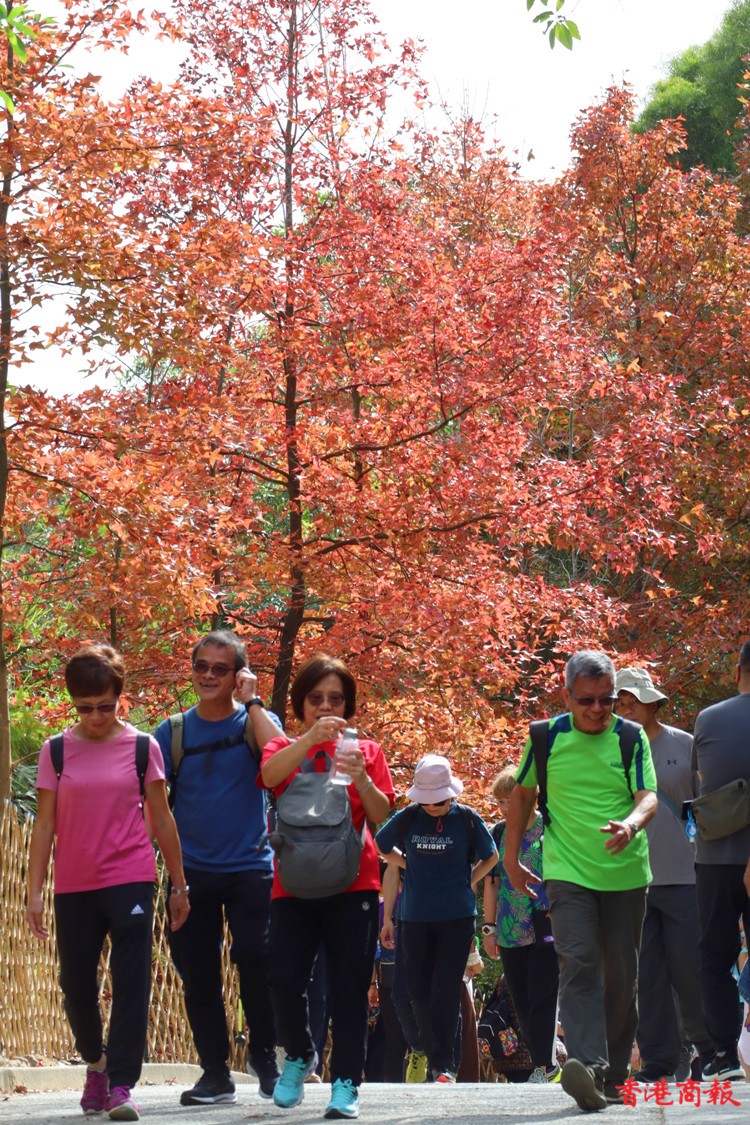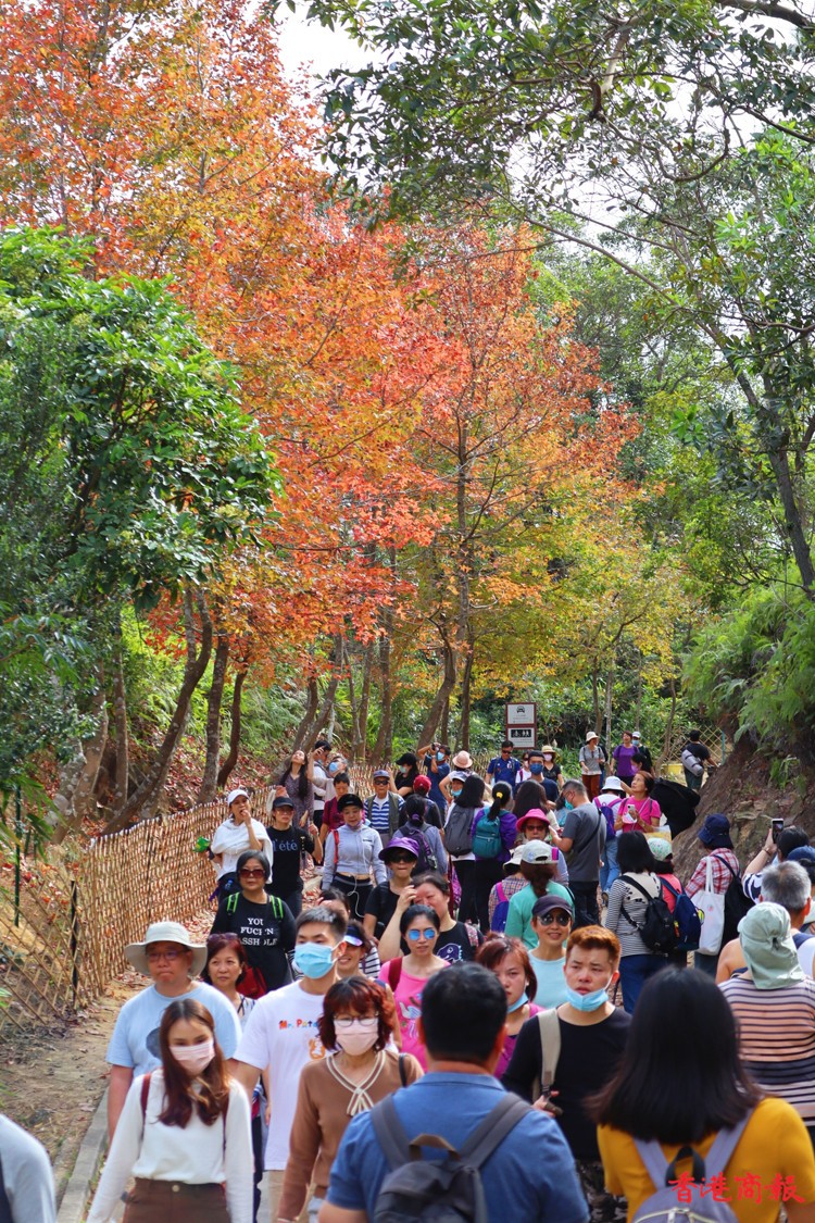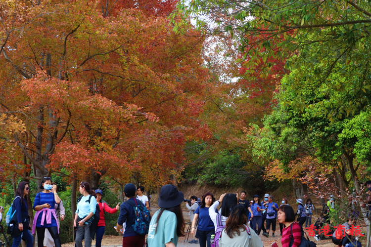 「隔斷紅塵三十里,白雲紅葉兩悠悠」。香港的楓林雖不是漫山通紅,但在綠林、藍天白雲和陽光的襯托,紅彤彤的楓葉仍令不少「楓迷」趨之若鶩。(馮瀚文攝)