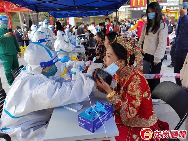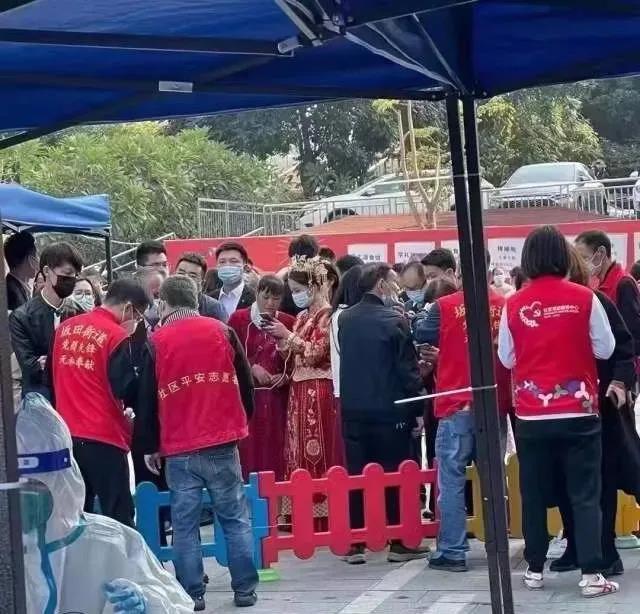 1月7日上午,在深圳龍崗區坂田街道馬安堂社區城立方核酸檢測採樣點,一位身着紅色嫁衣的女子及親友出現在排隊人群中,在工作人員的引導下,優先完成核酸檢測,並在隨後順利舉行了簡單的婚禮儀式。