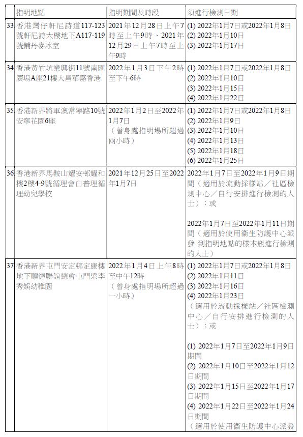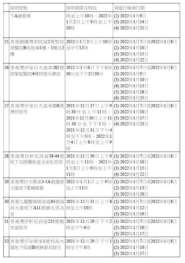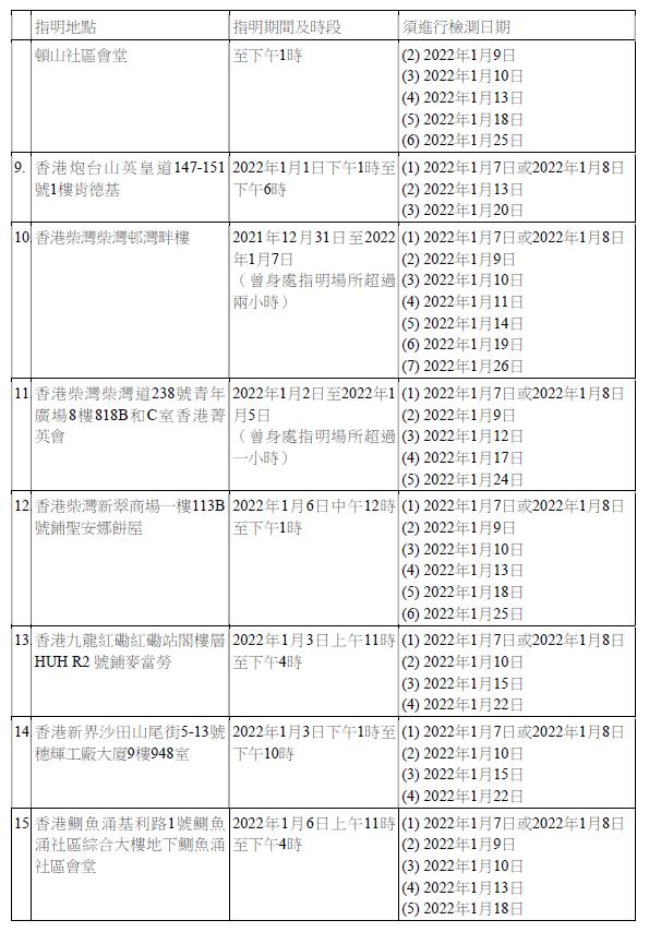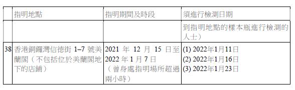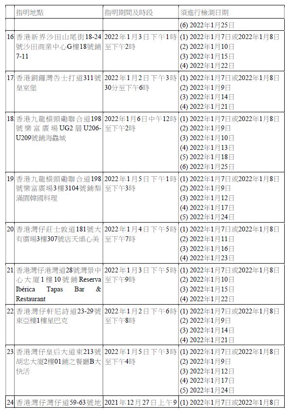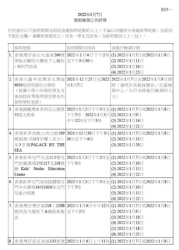 港府今早(8日)就強制檢測公告刊憲,要求於指定期間曾身處38個指明地方的人士接受新冠病毒核酸檢測,包括維園第55屆工展會、銅鑼灣皇室堡,以及港區全國人大代表洪為民的生日會舉辦地,位於灣仔灣景中心大廈的Reserva Ibérica Tapas Bar & Restaurant等。並繼續賦權註冊醫生於1月8日至1月21日的14日內,強制任何按其臨床判斷懷疑已染上新冠病毒的人接受檢測。