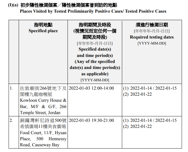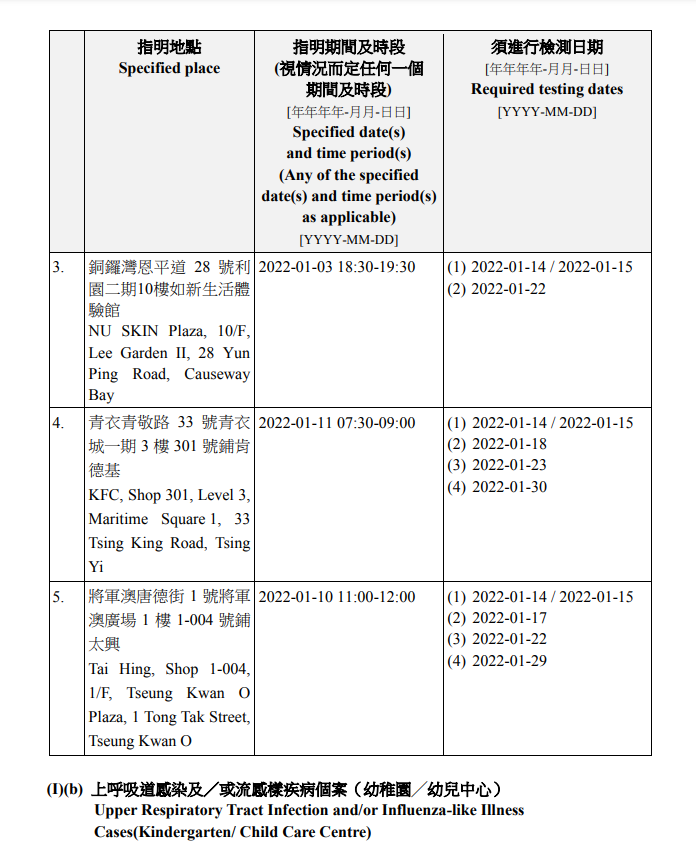 此外,政府1月8日公布的其中4個被納入強制檢測公告的指明地方,包括九龍樂富廣場UG2層U206-U209號鋪海鱻城、九龍樂富廣場3樓3104號鋪梨滿園韓國料理、灣仔莊士敦道181號大有廣場3樓307號店天頌心美,以及灣仔軒尼詩道23-29號東亞樓1樓星巴克,會予以刪除。另外,就政府1月10日公布的其中一個被納入強制檢測公告的指明地方,地址應為油麻地梁顯利油麻地社區中心社區檢測中心。任何在1月8日晚上7時至8時期間曾身處該指明地方的人士,須於指明日期接受強制檢測。