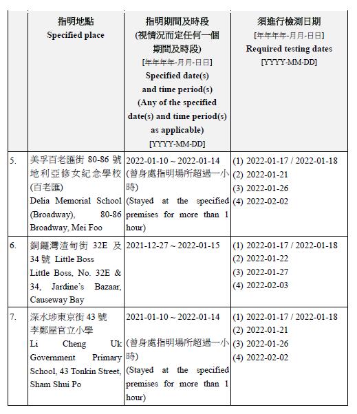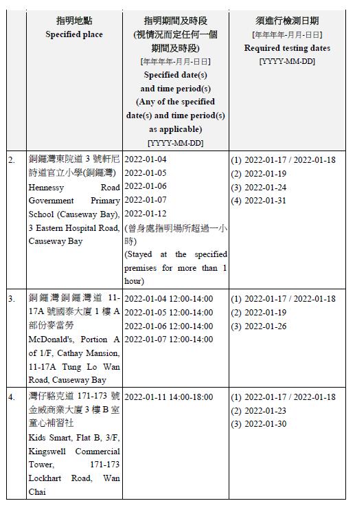 因應兩宗與輸入個案有關的個案,以及兩宗初步陽性檢測個案,有6個指明地方被納入強制檢測公告,包括北角寶馬山道20號蘇浙公學、銅鑼灣東院道3號軒尼詩道官立小學(銅鑼灣)、銅鑼灣銅鑼灣道11-17A號國泰大廈1樓A部分麥當勞、灣仔駱克道171-173號金威商業大廈3樓B室童心補習社、美孚百老匯街80-86號地利亞修女紀念學校(百老匯)、銅鑼灣渣甸街32E及34號LittleBoss,及深水埗東京街43號李鄭屋官立小學。