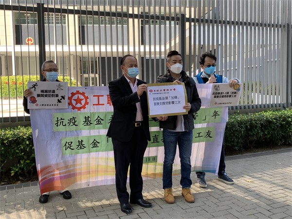 工聯權委主任丘燿誠聯同受影響行業工會代表今日(19日)到政府總部請願,促請政府為抗疫基金5.0「加碼」,向受影響行業從業員發放一次性現金津貼;另設立上限$9000(70117.2港元)、為期半年緊急失業/停工現金津貼,以真正達到「快狠準」效果。