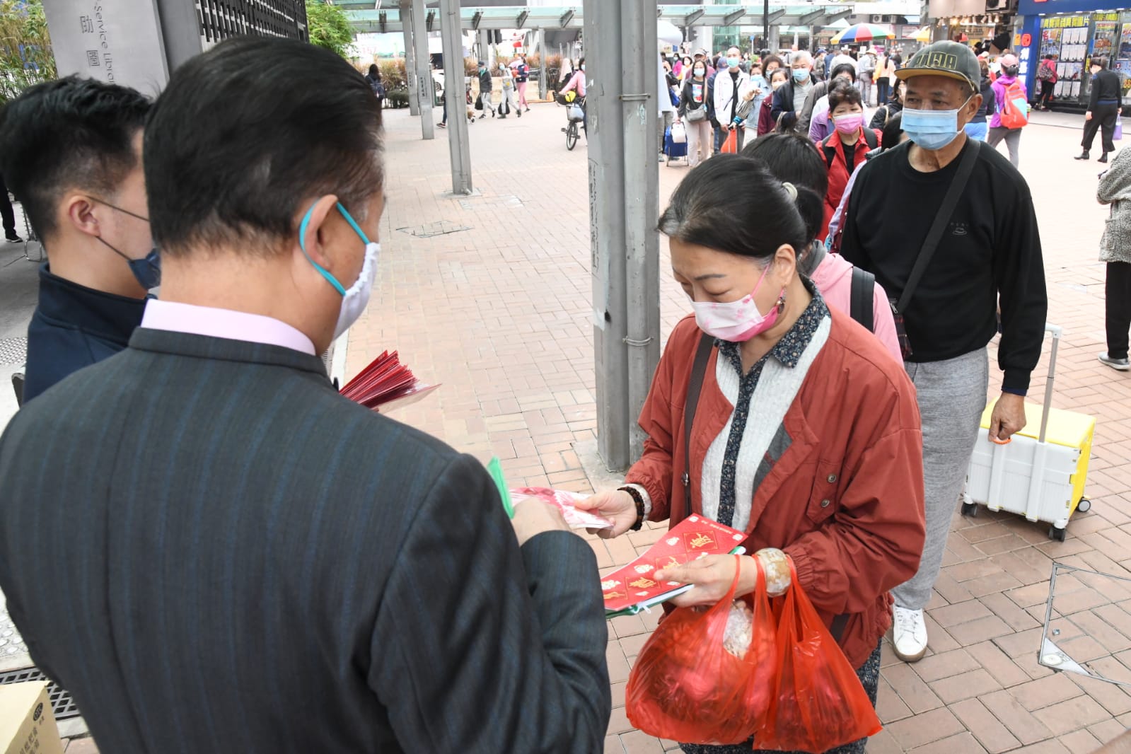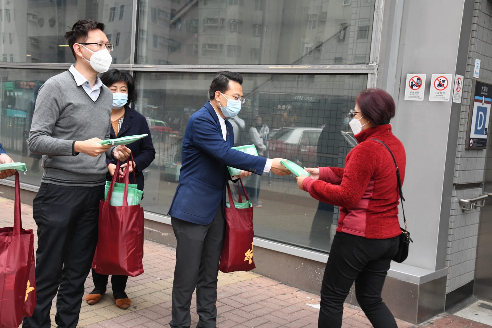 「全港社區抗疫連線」在大圍港鐵站外派發快速測試套裝,全國人大代表陳振彬、立法會議員陳勇、陳克勤、李梓敬亦有到場派發物資。「連線」在現場派發了合共1000份快速測試套裝及口罩。