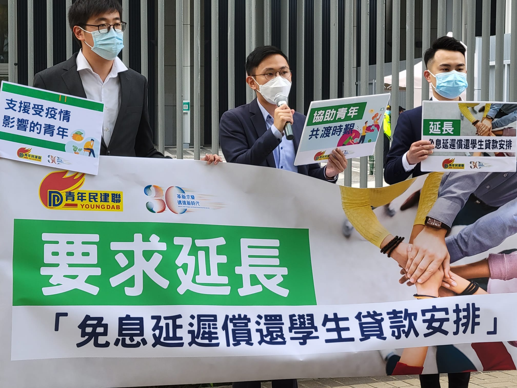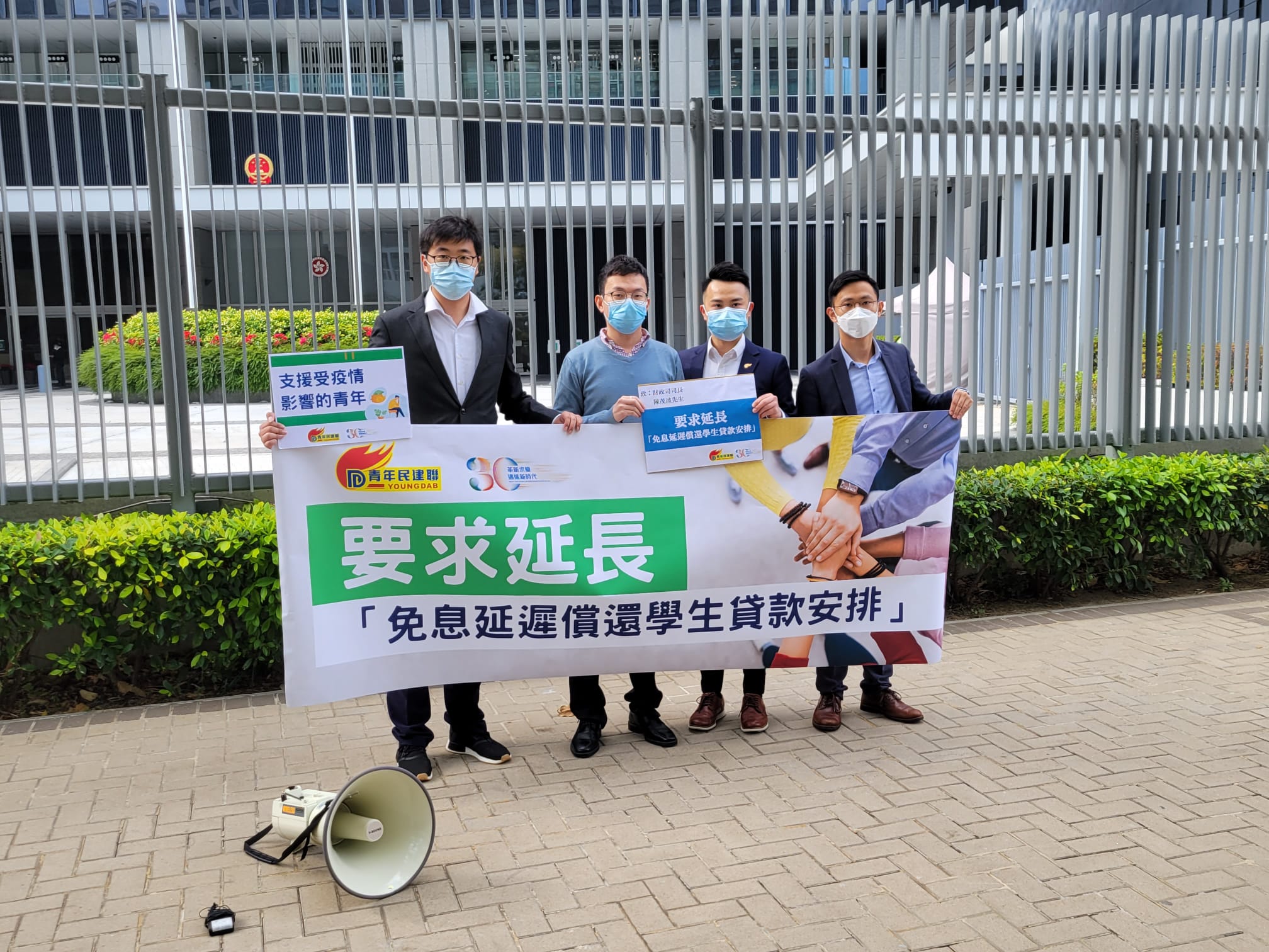 青年民建聯主席施永泰、副主席陳壇丹及鍾健峰今日(27日)下午到政府總部請願,要求當局延長「免息延遲償還學生貸款安排」不少於12個月,以協助青年渡時艱。