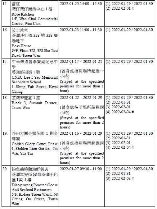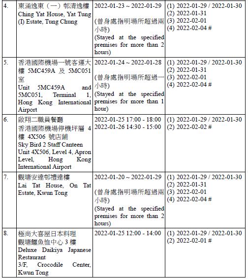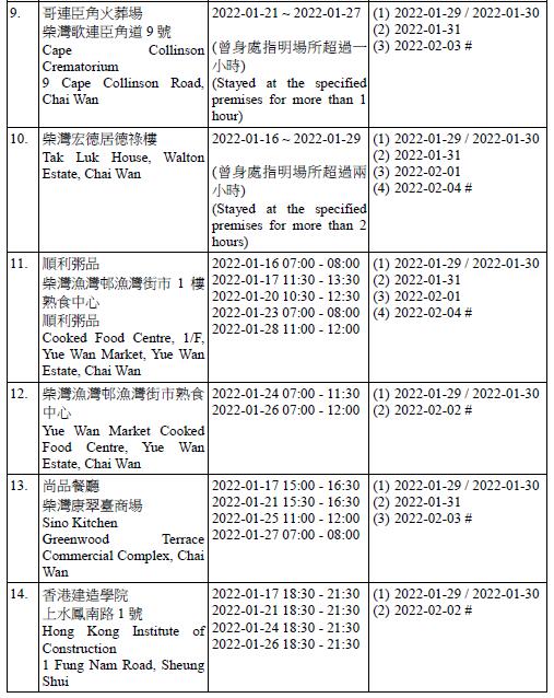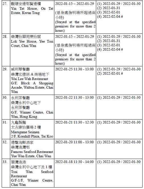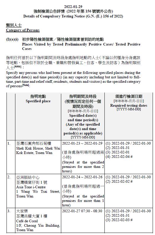 因應8宗本地或與本地個案有關的個案,及6宗與輸入個案有關或可能有關的個案,港府今早(30日)就強制檢測公告刊憲,要求於指定期間曾身處37個指明地方的人士接受強檢,包括荃灣石圍角邨石菊樓、荃灣昌耀大廈大家樂、東涌逸東邨清逸樓、觀塘安達邨禮達樓、哥連臣角火葬場、柴灣宏德居德祿樓、柴灣漁灣邨漁灣街市熟食中心等。
